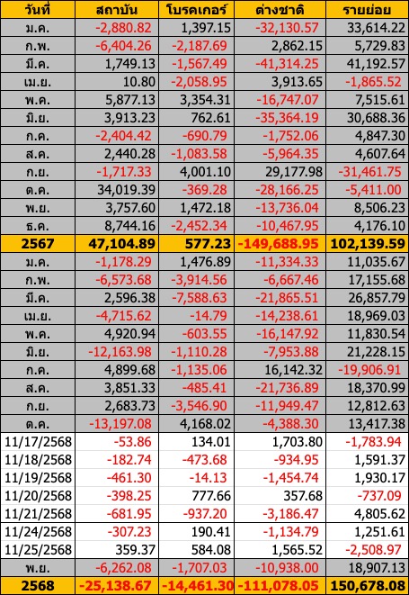 Sinthorn Summary 20/11/2568 : ต่างชาติขายสุทธิ -3,186.47 ลบ.