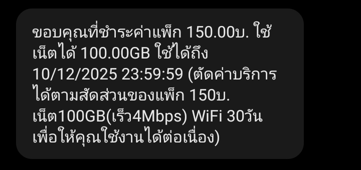 แพ็กคุ้มเวอร์! เล่นเน็ตไม่อั้นเร็ว 4Mbps จำนวน100GB ต่อด้วย 384Kbps พร้อม AIS SUPER WiFi ไม่จำกัดเพียง 150บ./ด. (ต่ออายุอัตโนมัติทุก30วัน นาน 6ด.) สมัครกด*788*4624# โทรออก ภายใน 15/02/2568 คือผมได้แพ
