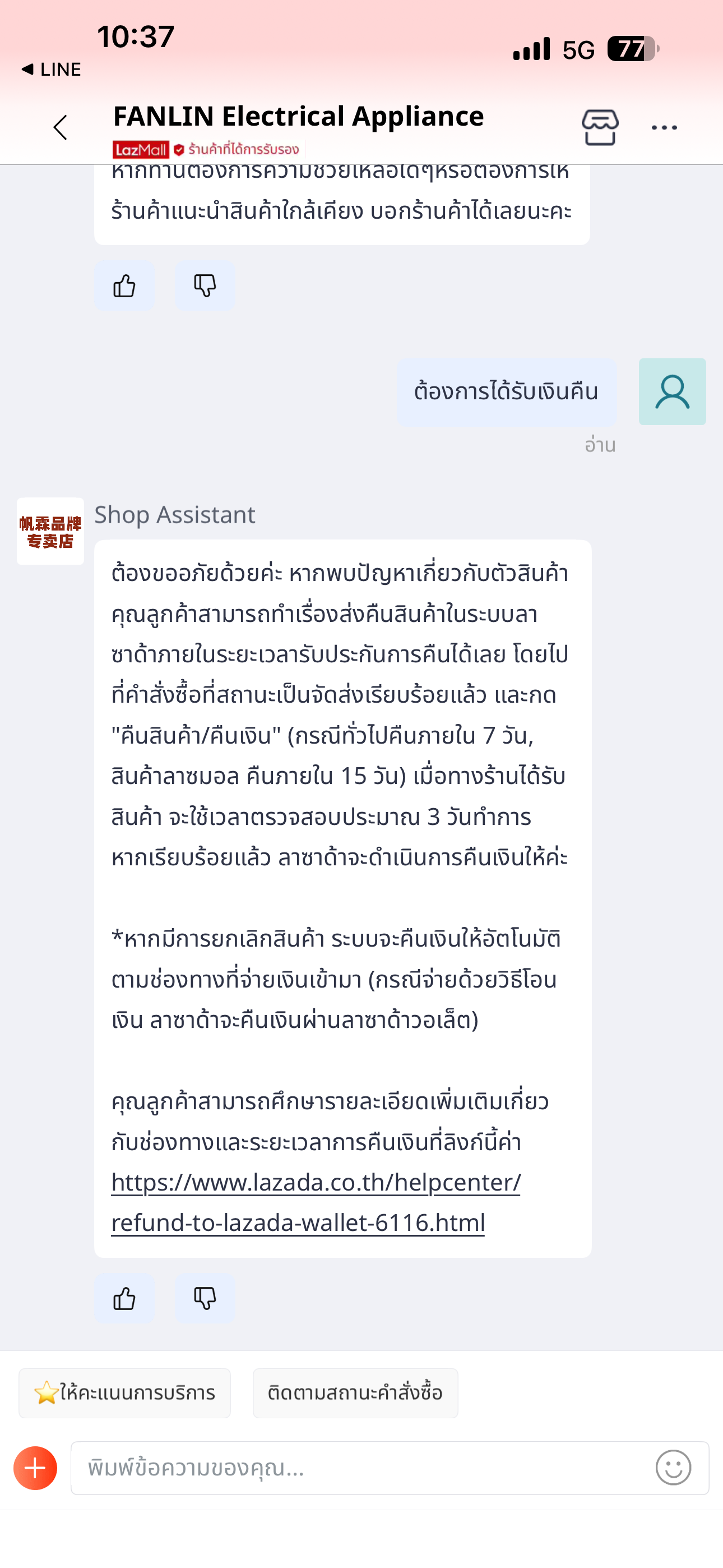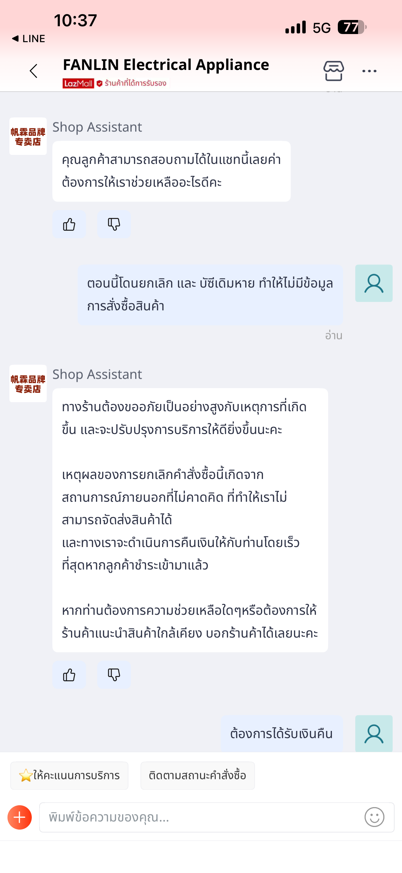 เวลาเรากดกดสินค้าได้ราคาถูกมากๆ มันจะไม่ส่งสินค้าในทันที รอเวลาหลายๆวันแล้วจะยกเลิกสินค้าเรา แต่ครั้งนี้เราจ่ายเงินเลย ดูว่า Lazada จะทำอย่างไร สุดท้ายก็ยกเลิกอยู่ดี แล้วทำเหมือนจะคืนเงินให้เรา แต่วันรุ่งขึ้น บัญชีเราในLazada ก็หลุดไป กลายเป็นสมาชิกใหม่ และไม่มีข้อมูลการสั่งซื้อเลยสักชิ้น เราก็จะขอคืนเงินตามขั้นตอนที่ Lazada แนะนำได้ ติดต่อร้านค้าที่ซื้อ เขาก็แนะนำเหมือนกันคือเริ่มจาก เข้าประวัติการสั่งซื้อ แต่เราไม่มีแล้วก็ทำอะไรไม่ได้ ช่วยแนะนำด้วยครับใครมีประสบการณ์ ทำยังไงจะได้เงินคืน
