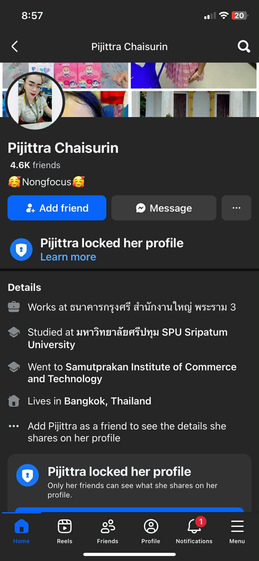 นี่เป็นภาพโปรไฟล์ของแอพ ไลน์ และ เฟสบุ๊ค ซึ่งในรูปยังปรากฏว่าใส่ชุดของพนักงานธนาคารกรุงศรีอยู่ แต่ปัจจุบันถูกไล่ออกจากธนาคารไปแล้ว