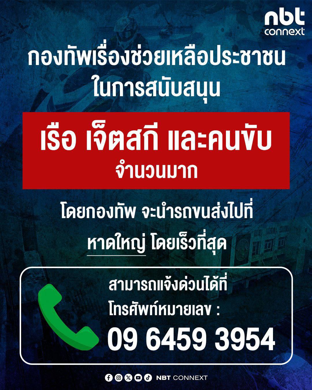 กองทัพ ขอรับความช่วยเหลือจาก ประชาชน และทุกภาคส่วน ในการสนับสนุน เรือ เจ็ตสกี และคนขับ จำนวนมาก โดยกองทัพ จะนำรถขนส่งไปที่ หาดใหญ่ โดยเร็ว