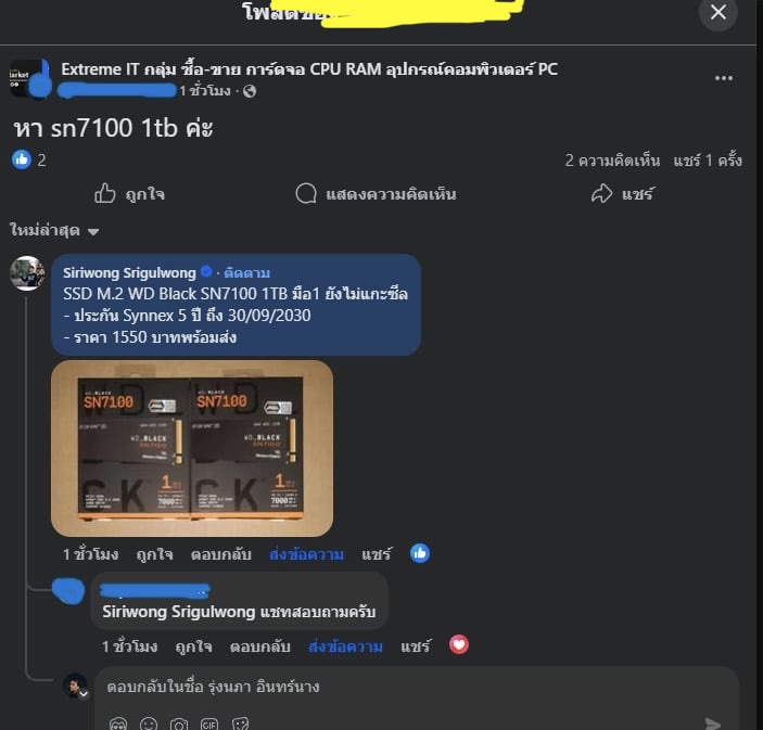 อันนี้เป็นการเตือนภัย เมื่อวันที่ 13 พย 68 ที่ผ่านมา เราสนใจ WD SN7100 1TB ในราคามือสอง เลยไปประกาศหาในกลุ่มเฟซบุ๊ก "Extreme IT กลุ่ม ซื้อ-ขาย การ์ดจอ CPU RAM อุปกรณ์คอมพิวเตอร์ PC" ตอน 22:30 น. ว่า "หา sn7100 1tb ค่ะ" แล้วผู้ต้องสงสัยใช้เฟซบุ๊กชื่อ"Siriwong Srigulwong (