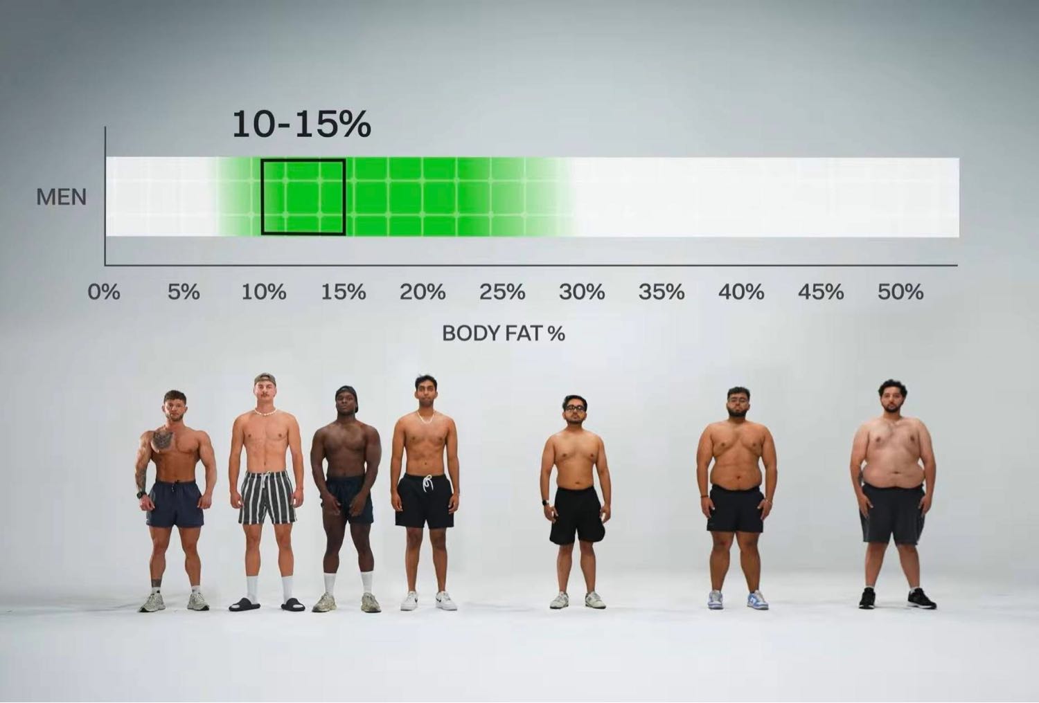 * 12% (ผู้ชาย): รูปร่างฟิตมาก มี six-pack ที่ชัดเจน ริ้วกล้ามเนื้อ (visible striations) เริ่มปรากฏเมื่อเกร็ง ต้องอาศัยวินัยด้านอาหารอย่างจริงจัง และการจำกัดอาหารเพื่อรักษาระดับนี้ไว้
