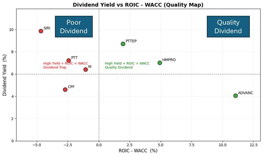 1) High Yield + ROIC > WACC → Quality Dividend (ของจริง)
