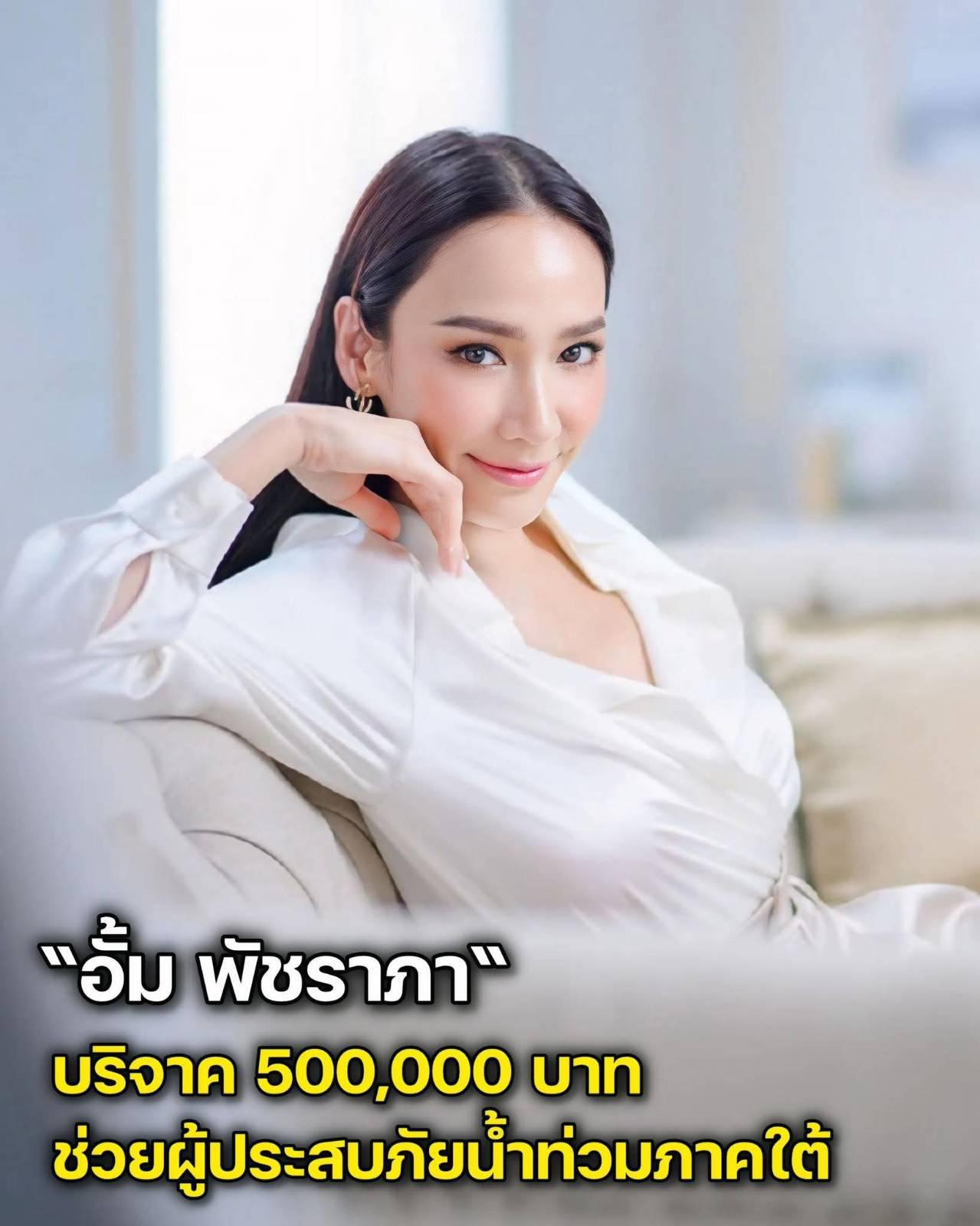 พลังน้ำใจของคนบันเทิงนั้นงดงามและยิ่งใหญ่เสมอ เพื่อร่วมบรรเทาทุกข์น้ำท่วมภาคใต้ มีการบริจาคเงินจำนวนมหาศาลเพื่อช่วยเหลือผู้ประสบภัย ล่าสุดมีรายงานว่านางเอกซุปตาร์ “อั้ม พัชราภา” บริจาค 500,000 บาท 🙏🏻🤍