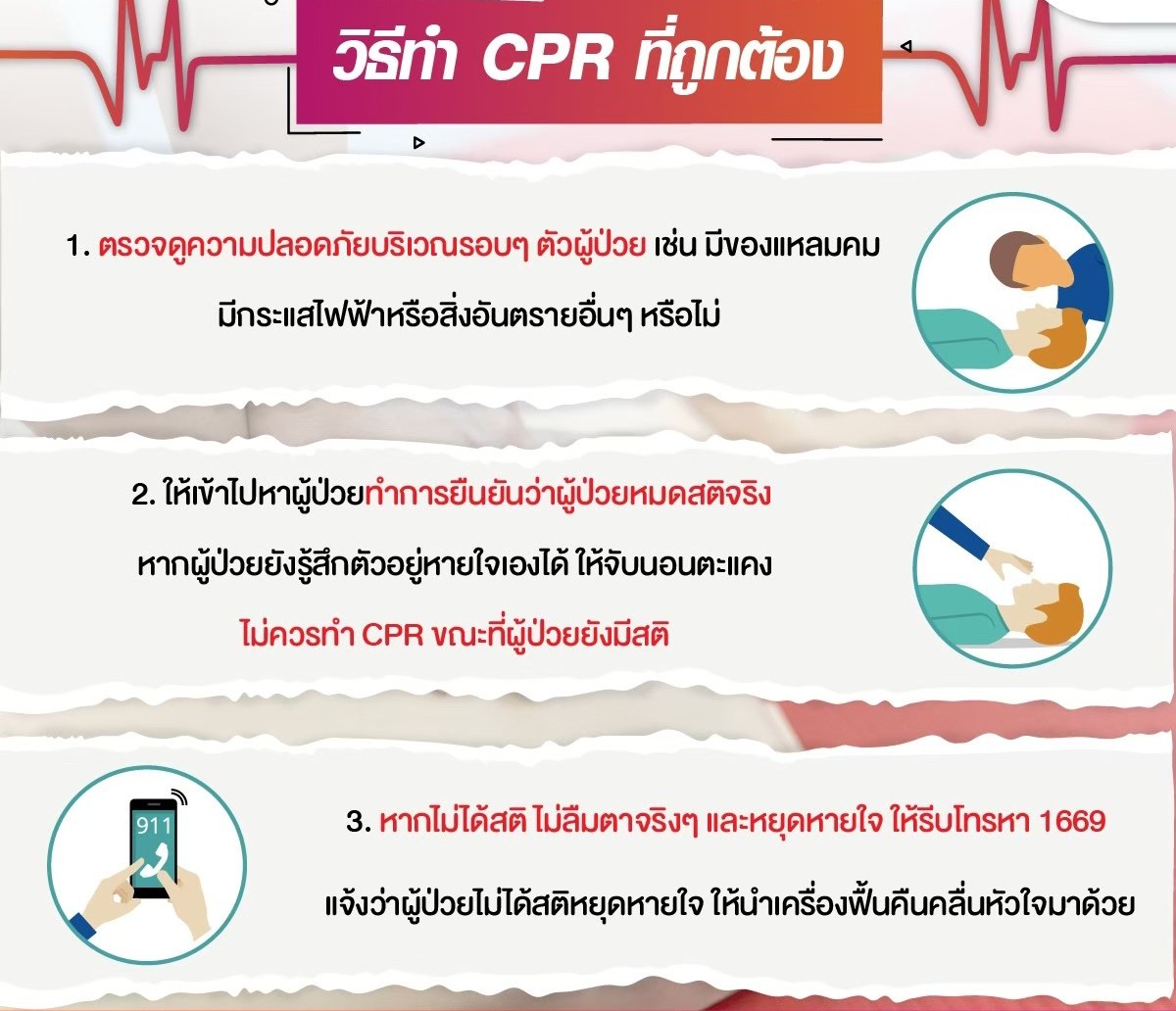 สิ่งที่ต้องทำทันที: หากพบว่าไม่หายใจและหมดสติจริง ให้รีบ โทร 1669 แจ้งเหตุการณ์ สถานที่ และเริ่ม CPR ทันที!