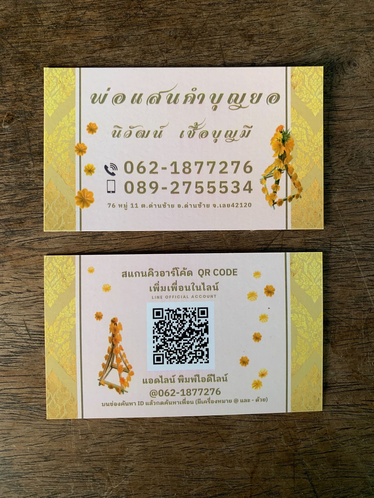 ปกติแล้วนักท่องเที่ยวก็จะเข้ามาแบบ Walk-in อยู่แล้ว ถ้าไม่ได้หาข้อมูลมาก่อนแล้วอยากถวายต้นผึ้งบ้าง เขามีสำรองไว้ให้นิดหน่อยค่ะ แต่จากประสบการณ์คือ สั่งล่วงหน้าชัวร์กว่า เพราะต้นผึ้งสำรองน้อยมากและหมดไวค่ะ ถ้าเราได้เจอกับพ่อแสนและได้ถวายต้นผึ้งแล้ว ปกติก็จะได้รับนามบัตรไว้สำหรับติดต่อในภายหลัง ส่วนตัวเราก็ติดต่อกับพ่อแสนคำบุญยอตลอด ข้อมูลต่อจากนี้จะขอรีวิวการใช้บริการกับพ่อแสนคำบุญยอคนนี้เท่านั้นนะคะ (นามบัตรนี้เราได้มาปีนี้เอง เหมือนว่าจะเป็นแบบใหม่)