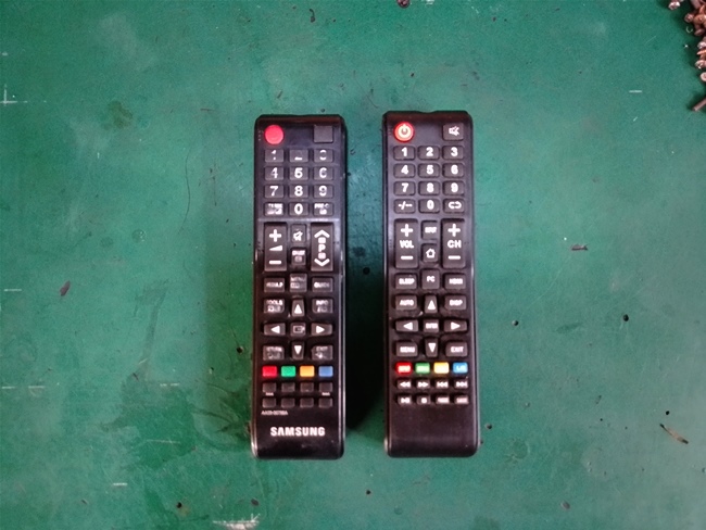 รูปรีโมทของทีวีราคาถูก(ขวา) เทียบกับของ Samsung (ซ้าย) ส่วนยี่ห้อทีวีราคาถูกที่ผมซื้อมาขอไม่บอกยี่ห้อและผมเชื่อว่ายี่ห้ออื่นที่ขายถูกพอๆ กับของมือสองก็จะใช้วิธีลดต้นทุนแบบเดียวกันนี้ การลดต้นทุนของเขาทำดังนี้