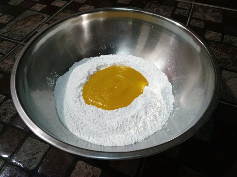 นวดแป้งข้าวเหนียวกับน้ำฟักทอง