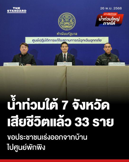 ศป.กฉ. แถลงสถานการณ์น้ำท่วมใต้ 7 จังหวัด เสียชีวิตแล้ว 33 ราย ขอประชาชนเร่งออกจากบ้าน ไปศูนย์พักพิง