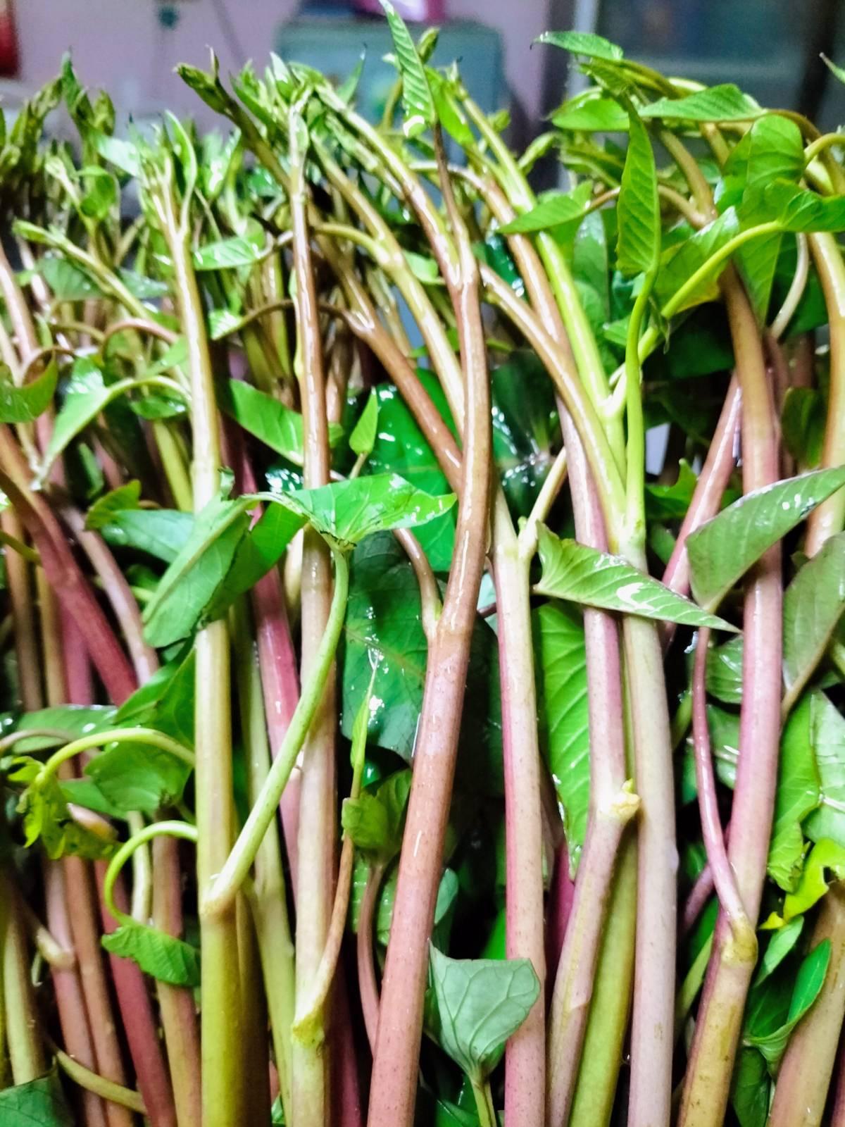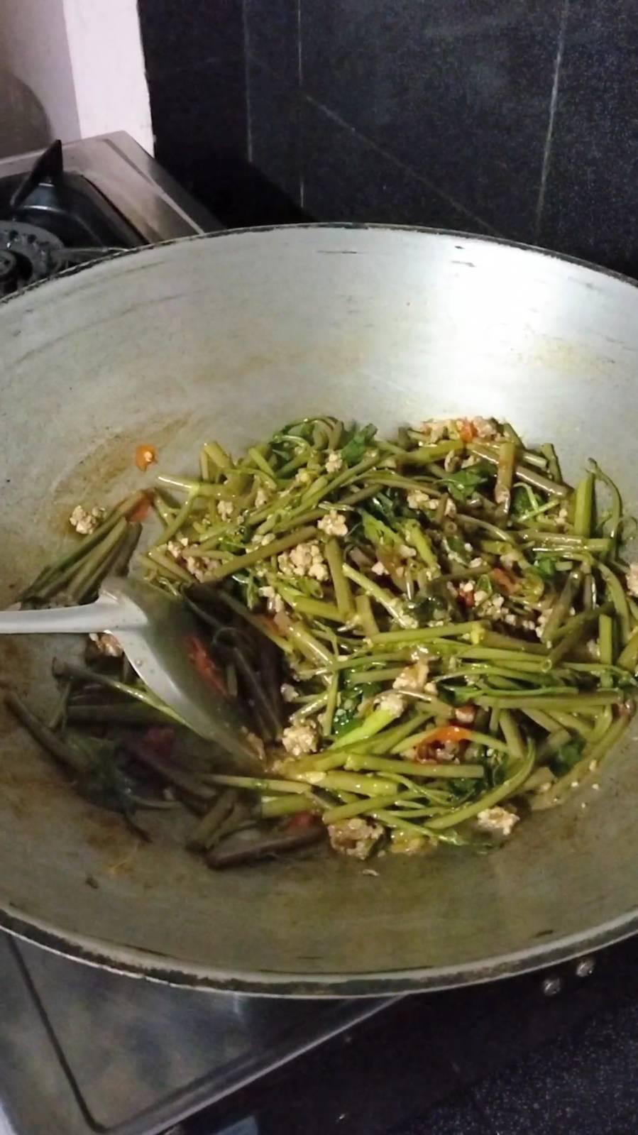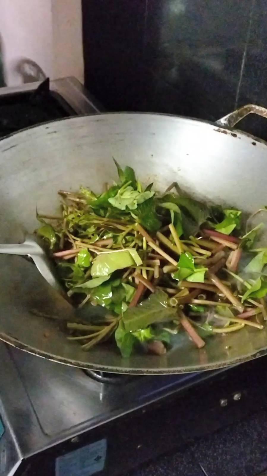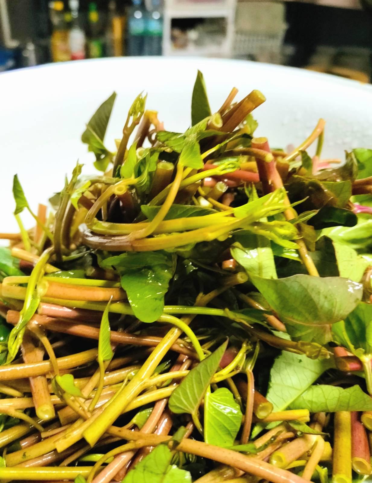 1.ผักบุ้งไทย : ล้างสะอาด หั่นเป็นท่อนพอดีคำ