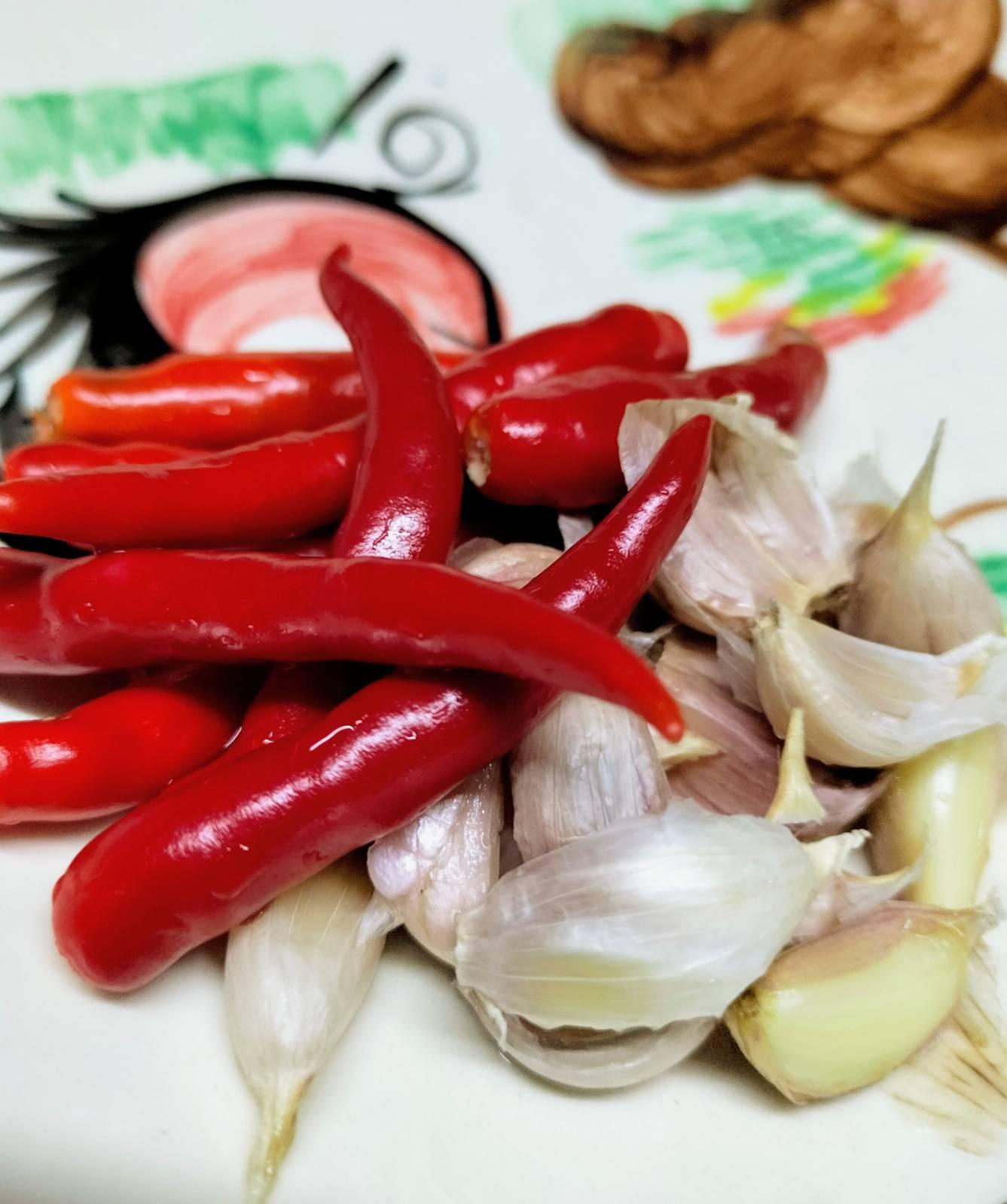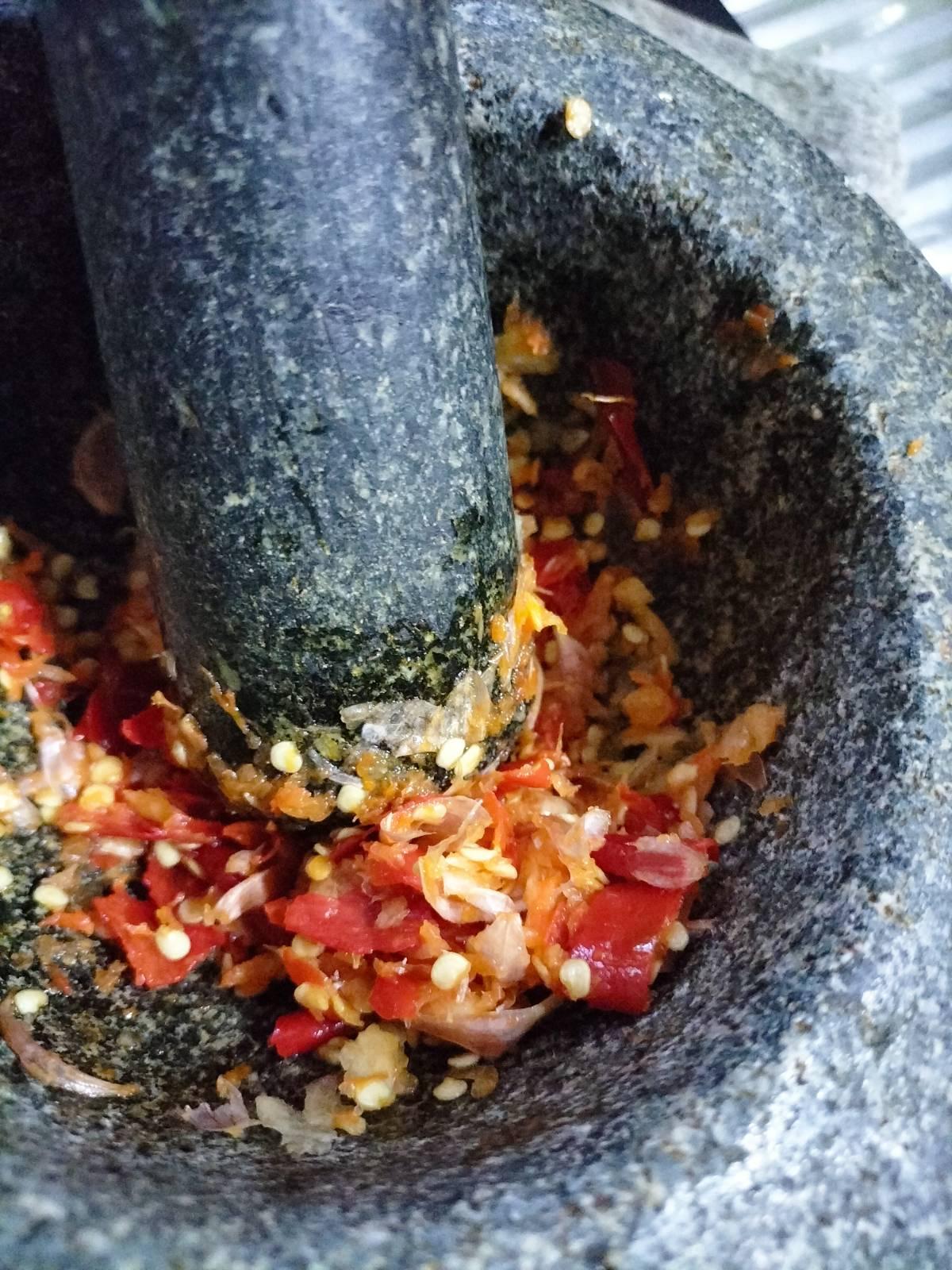 1.นำพริกจินดาแดงและกระเทียมลงไปโขลกในครกพอหยาบๆ