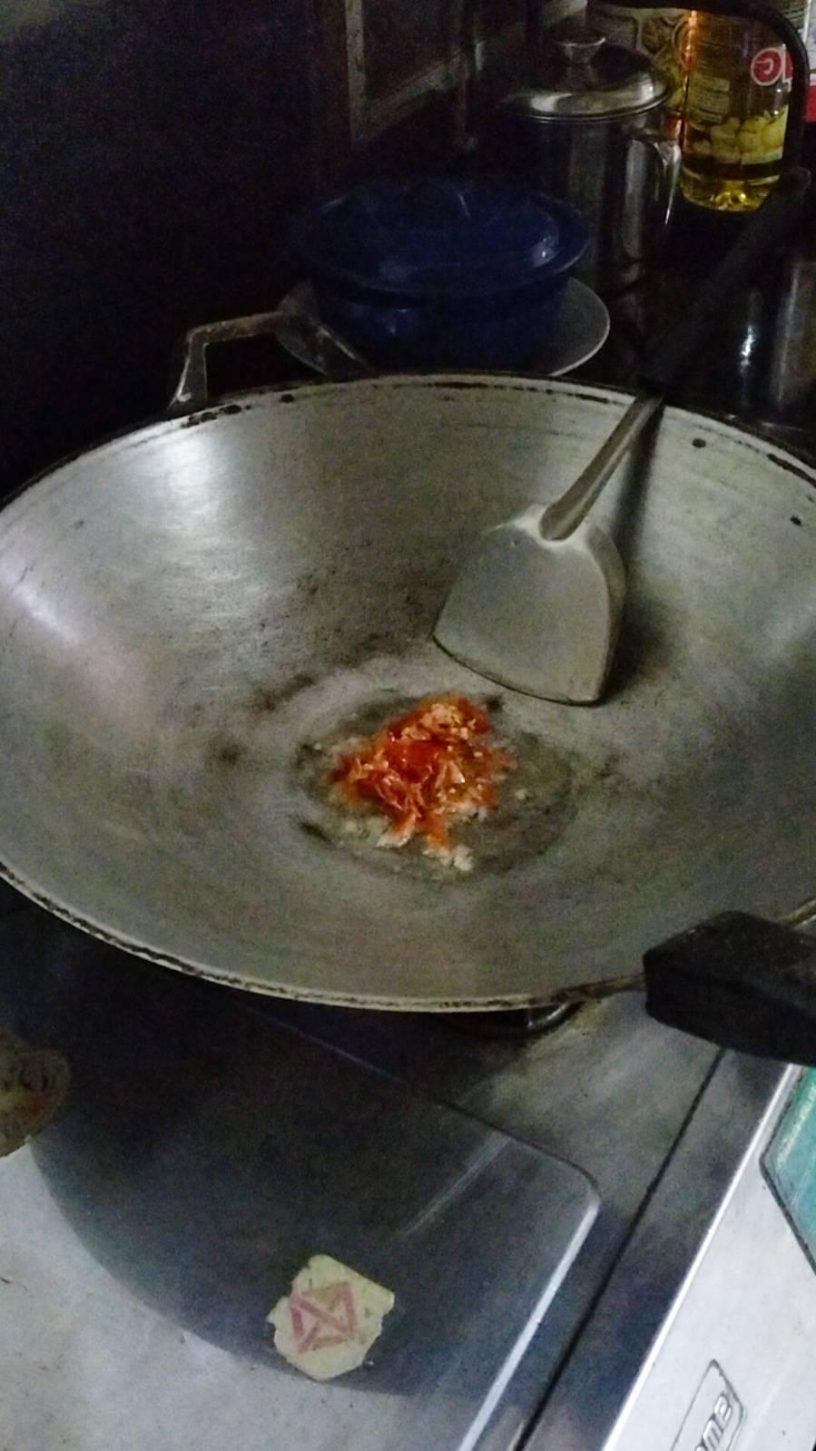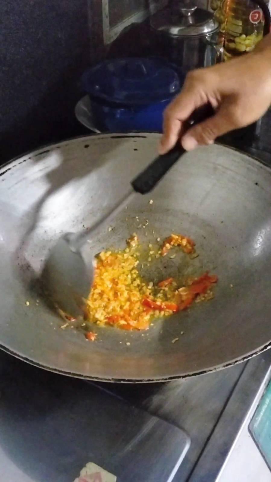 2.ตั้งกระทะใส่น้ำมัน พอร้อนได้ที่ นำพริกกระเทียมที่โขลกไว้ลงไปผัดให้หอมฉุย ไกลไปถึงข้างบ้าน 555+