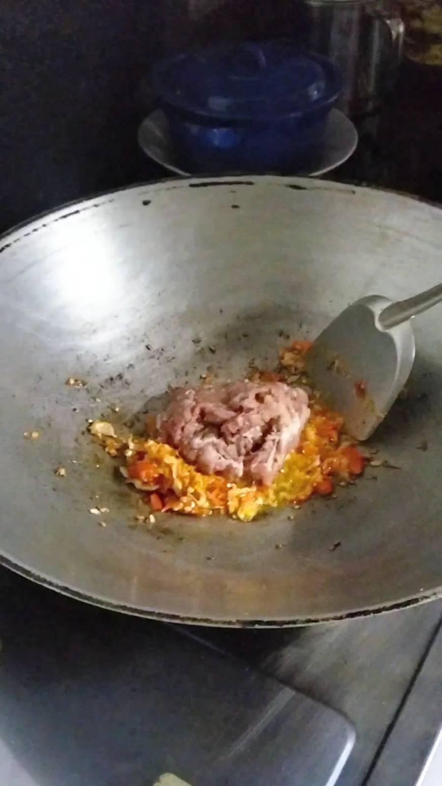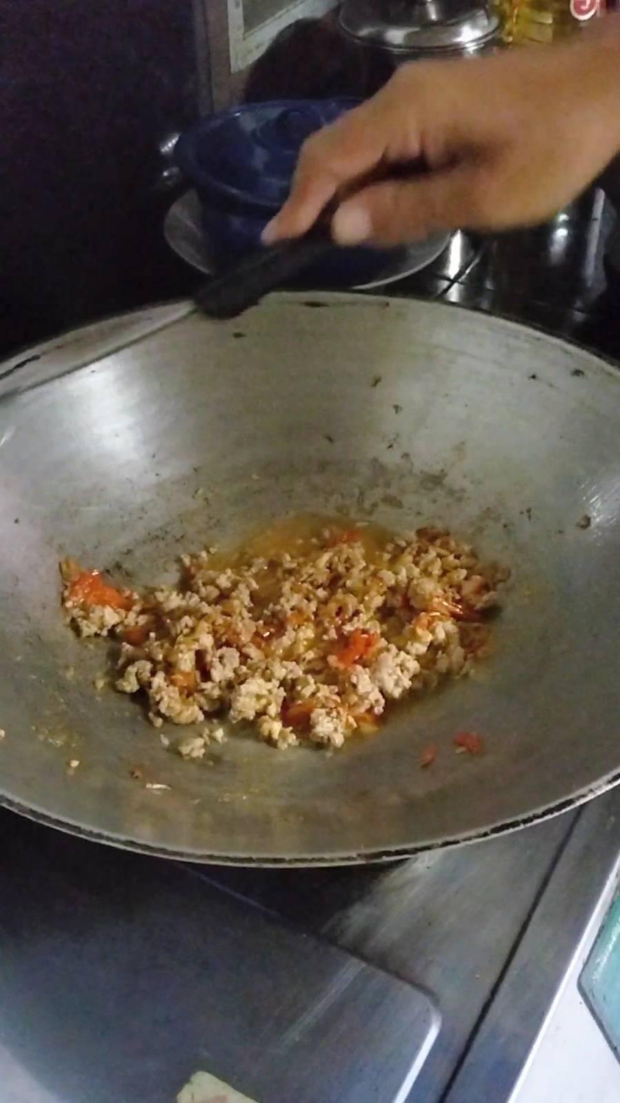 3. ใส่หมูสับลงไปผัดยีๆ ให้หมูเกือบสุก