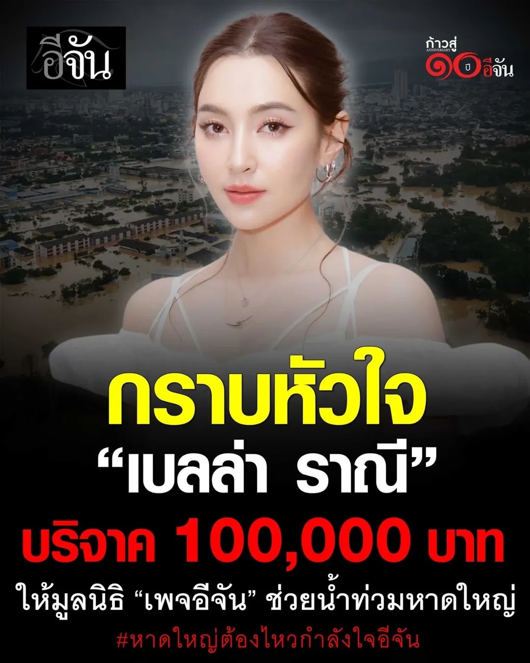 🙏 อนุโมทนาบุญ 🙏 กราบหัวใจ “เบลล่า ราณี” บริจาคเงิน 𝟏 แสนบาท ให้มูลนิธิ “เพจอีจัน” นำไปช่วยเหลือผู้ประสบอุทกภัย 📌