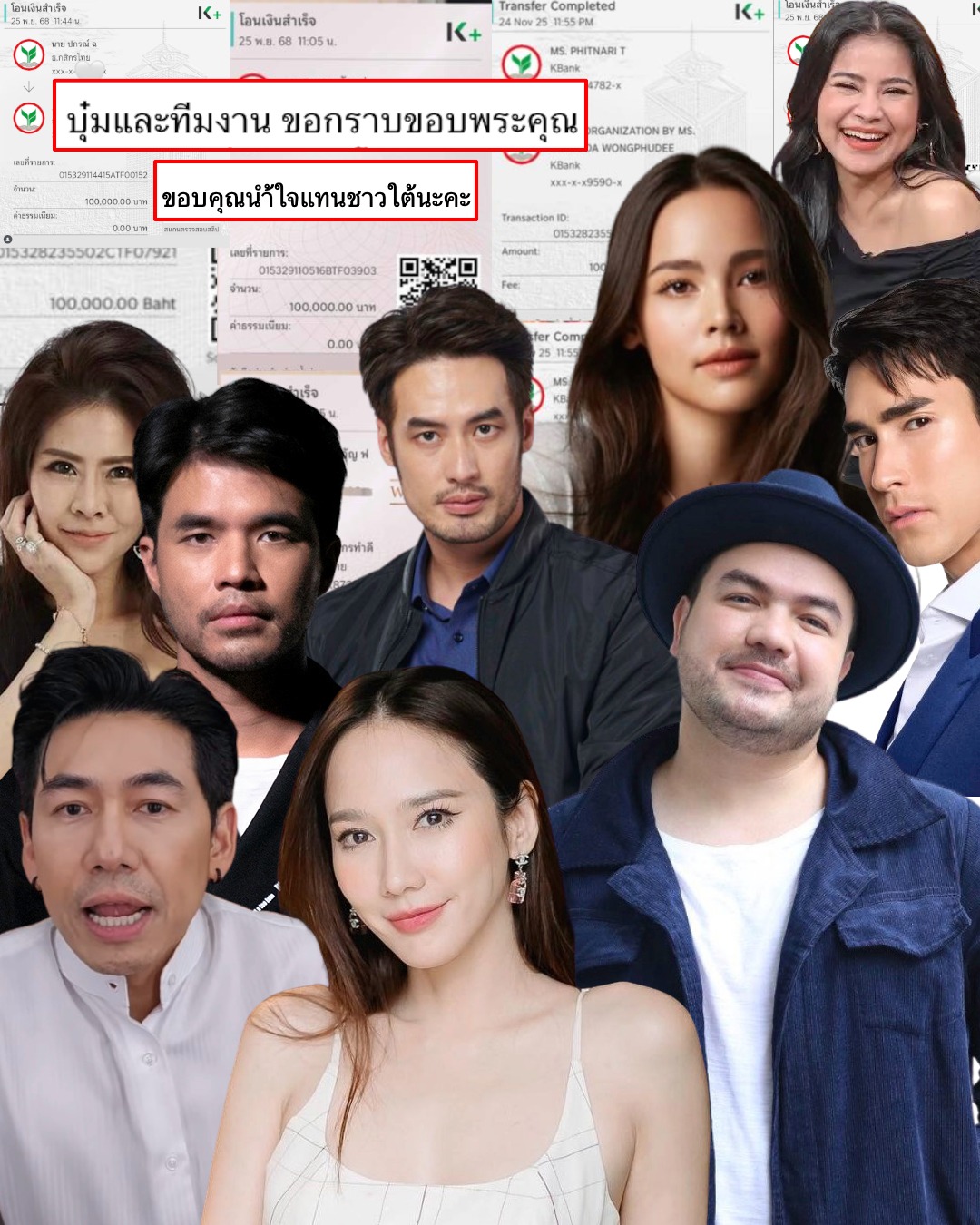 พลังน้ำใจของคนบันเทิงนั้นงดงามและยิ่งใหญ่เสมอ เพื่อร่วมบรรเทาทุกข์น้ำท่วมภาคใต้ มีการบริจาคเงินจำนวนมหาศาลเพื่อช่วยเหลือผู้ประสบภัย โดย โอ๊ต ปราโมทย์ ได้นำทัพบริจาคสูงสุดถึง 1,000,000 บาท ตามมาด้วย อั้ม พัชราภา 500,000 บาท และคู่รัก ณเดชน์ คูกิมิยะ - ญาญ่า อุรัสยา 300,000 บาท