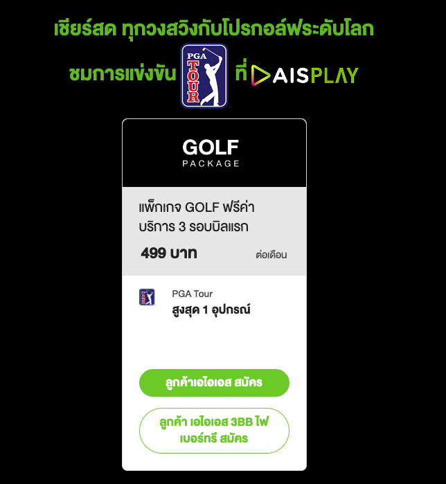 3. ชม PGA TOUR บน AIS PLAY ตั้งแต่ฤดูกาลปกติ เพลย์ออฟ จนไปถึงทัวร์ระดับแฟลกชิป บรรยายไทยโดยมืออาชีพ  พิเศษ! ช่วง Early Bird สมัครตอนนี้ฟรี 3 รอบบิลแรก หลังจากนั้นเพียง 499 บาท/เดือน (ระหว่าง 26 พฤศจิกายน 2568 – 15 ธันวาคม 2568)