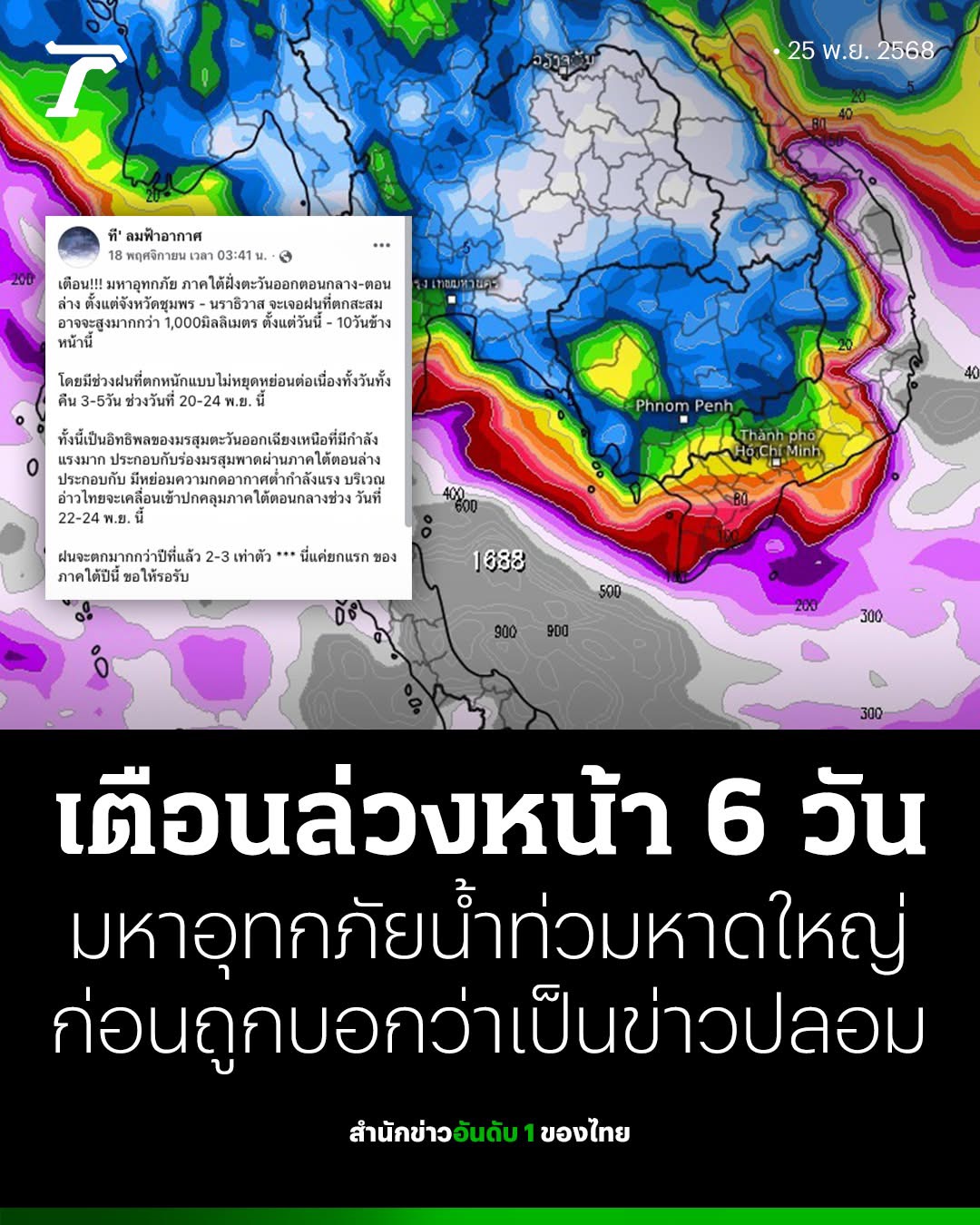 ทั้งนี้ โพสต์ของเพจที่ถูกระบุว่าเป็นข้อมูลบิดเบือน โพสต์ไว้เมื่อวันที่ 18 พ.ย.68 ระบุข้อความว่า “ เตือน!!! มหาอุทกภัย ภาคใต้ฝั่งตะวันออกตอนกลาง-ตอนล่าง ตั้งแต่จังหวัดชุมพร - นราธิวาส จะเจอฝนที่ตกสะสม อาจจะสูงมากกว่า 1,000 มิลลิเมตร ตั้งแต่วันนี้ - 10 วันข้างหน้านี้