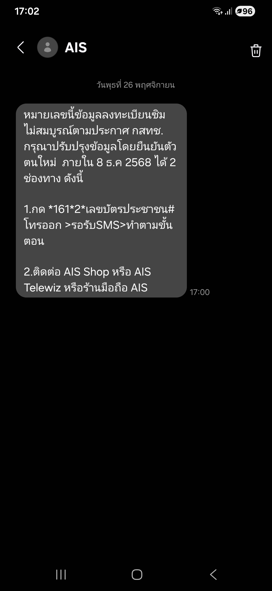 ได้รับข้อความจาก AIS ว่าลงทะเบียนซิมไม่สมบูรณ์