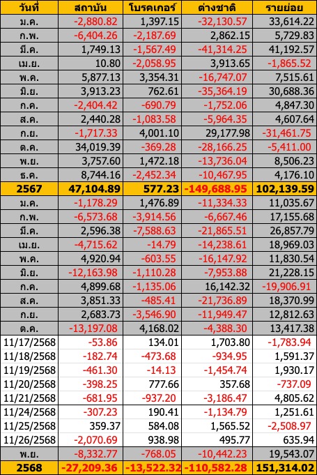 Sinthorn Summary 20/11/2568 : ต่างชาติขายสุทธิ -3,186.47 ลบ.