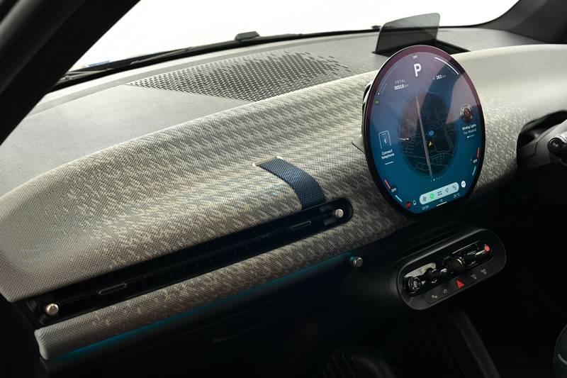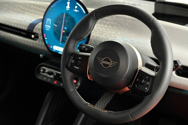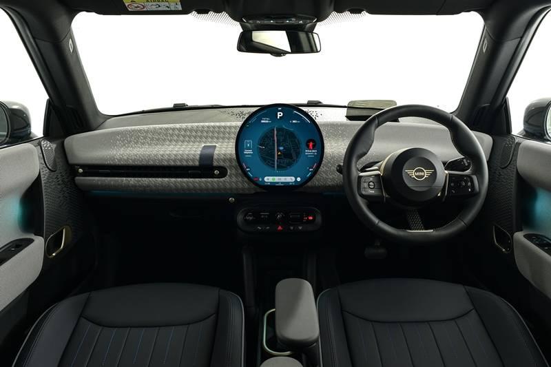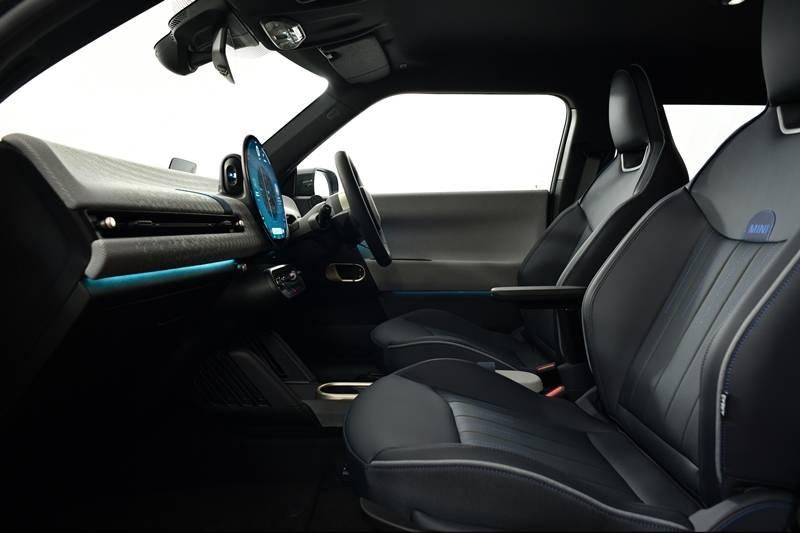 MINI Cooper SE Hightrim รักษาเสน่ห์ภายนอกใน ไฟหน้า LED ทรงกลม ไฮไลต์ของรุ่นนี้ได้แก่ ล้อแม็กซ์ Night Flash Spoke 2-Tone ขอบ 18 นิ้ว สีใหม่ Indigo Sunset Blue ภายในห้องโดยสาร ระบบเครื่องเสียง Harm