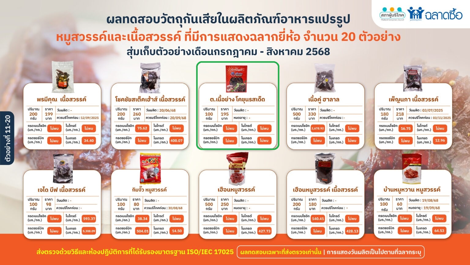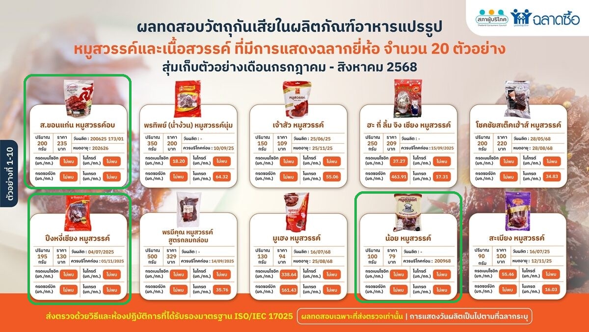 สภาผู้บริโภคและนิตยสารฉลาดซื้อ มูลนิธิเพื่อผู้บริโภค ร่วมแถลงเฝ้าระวังสินค้าผลิตภัณฑ์เนื้อสัตว์แปรรูป ผลทดสอบวัตถุกันเสีย 4 ชนิด ได้แก่ กรดเบนโซอิก, กรดซอร์บิก, ไนเทรต, และไนไทรต์ ในผลิตภัณฑ์เนื้อสัตว์แปรรูปจำนวน รวม 20 ตัวอย่าง ได้แก่ หมูสวรรค์ 13 ตัวอย่างและเนื้อสวรรค์ 7 ตัวอย่าง สุ่มเก็บตัวอย่างเดือนกรกฎาคม – สิงหาคม 2568 จากร้านค้าออนไลน์ 16 ตัวอย่าง และร้านค้าปลีกในพื้นที่กรุงเทพฯ และต่างจังหวัด 4 ตัวอย่าง