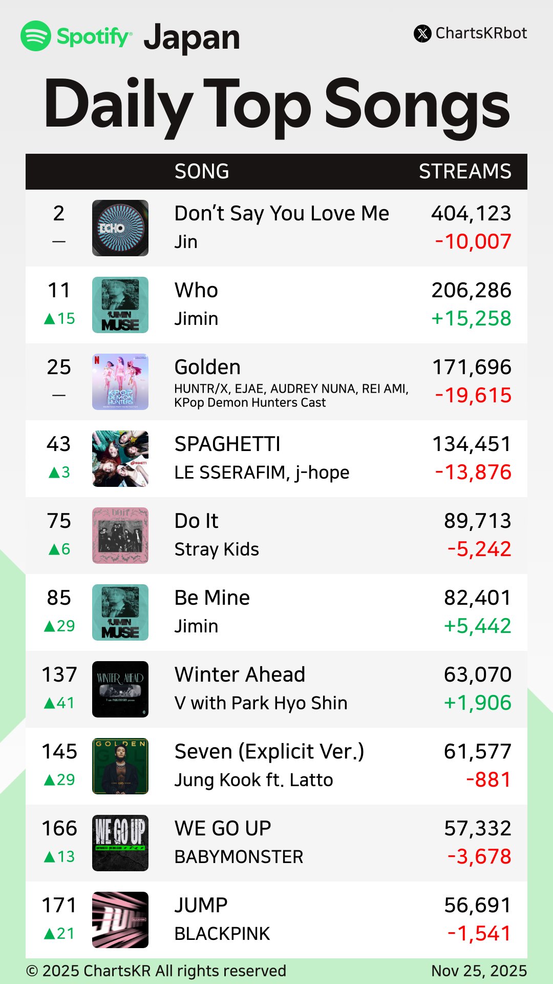 เพลง WE GO UP ของ BABYMONSTER อยู่ในอันดับ 173 บน Spotify Japan Daily Top Song Chart เป็นเพลงเดียวจากไอดอลเคป๊อปเจน 5