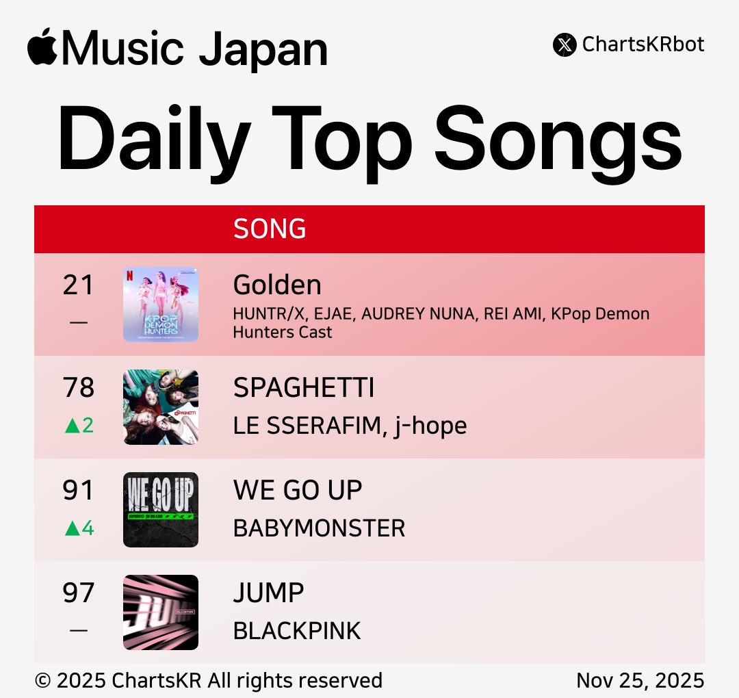 เพลง WE GO UP ของ BABYMONSTER ยังคงอยู่ในอันดับ 98 บน Apple Music Japan Daily Chart เป็นเพลงเดียวจากไอดอลเคป๊อปเจน 5 เป็นลูกรักคนญี่ปุ่นจริงๆ อย่างว่าแหละตลาดเพลงใหญ่อันดับ 2 ของโลกรองจากอเมริกาเท่าน