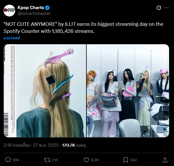 NOT CUTE ANYMORE ของ ILLIT เปิดตัววันแรกด้วยยอดสตรีม 776,015 บน Spotify สูงสุดของวงจากเจน 5 ปีนี้ แม้จะเก็บยอดแค่ 15 ชม.