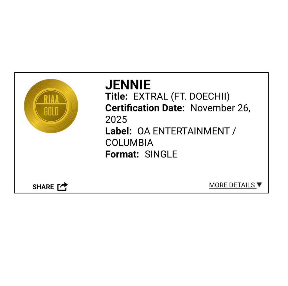 เพลง “ExtraL (ft. Doechii)” ของเจนนี่ ได้รับการรับรองยอดขายระดับ GOLD จากสมาคมอุตสาหกรรมเพลงของสหรัฐอเมริกา (RIAA) มียอดขายมากกว่า 500,000 units ในสหรัฐอเมริกา 🇺🇸