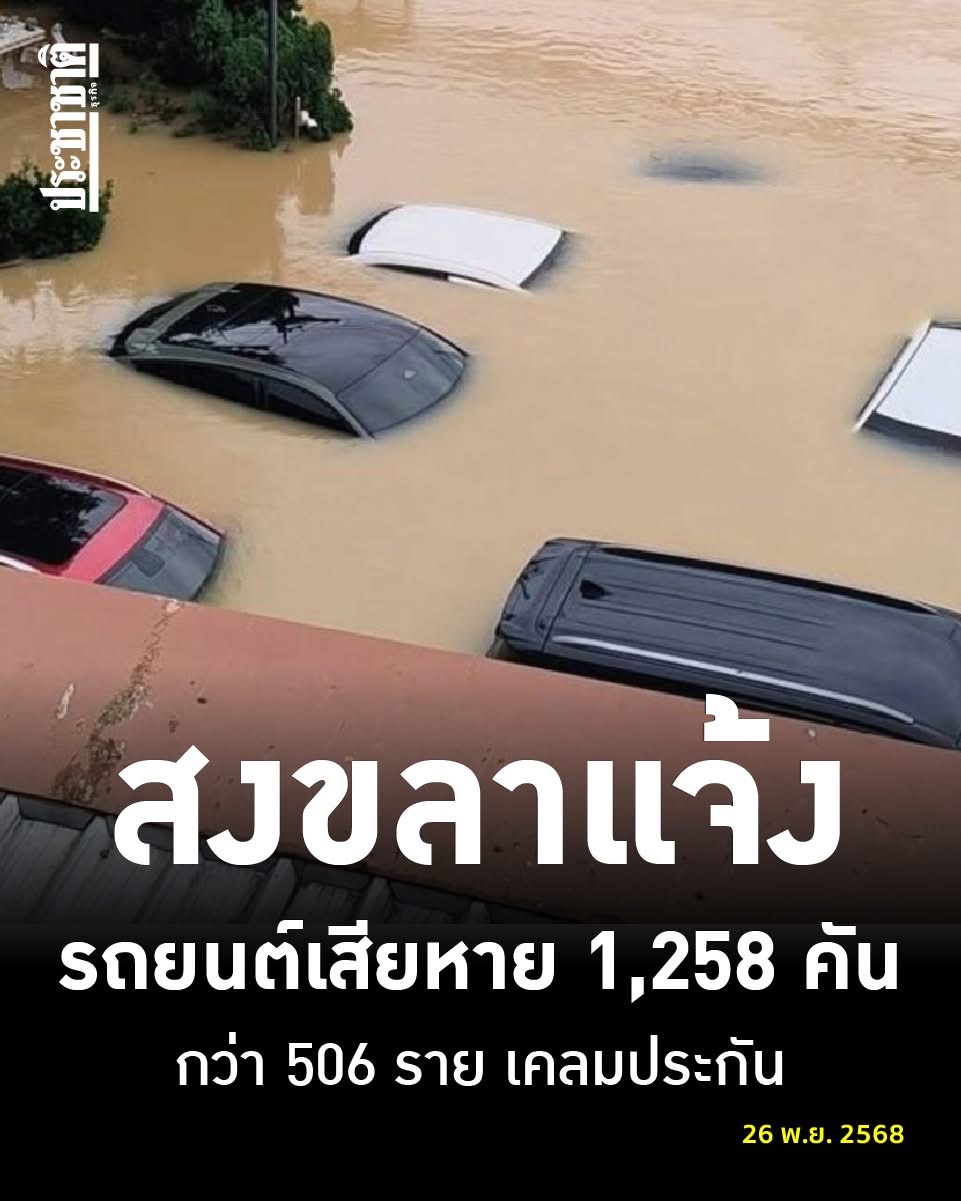 จากข้อมูลความเสียหายด้านการประกันภัยล่าสุด ณ วันที่ 26 พฤศจิกายน 2568 พบว่า บริษัทประกันภัยได้รับแจ้ง ความเสียหายจากประชาชนในพื้นที่จังหวัดสงขลา โดยเบื้องต้นเป็นการแจ้งความเสียหายรถยนต์ จำนวน 1,258 คัน และแจ้งความเสียหายทรัพย์สินและอื่น ๆ อีกกว่า 506 ราย