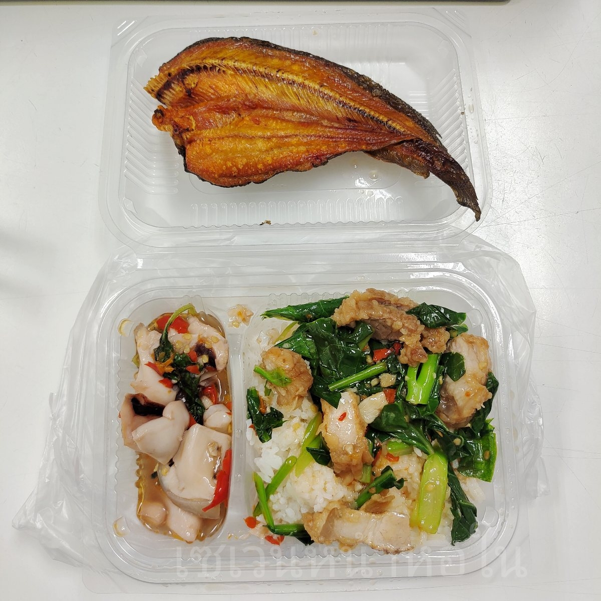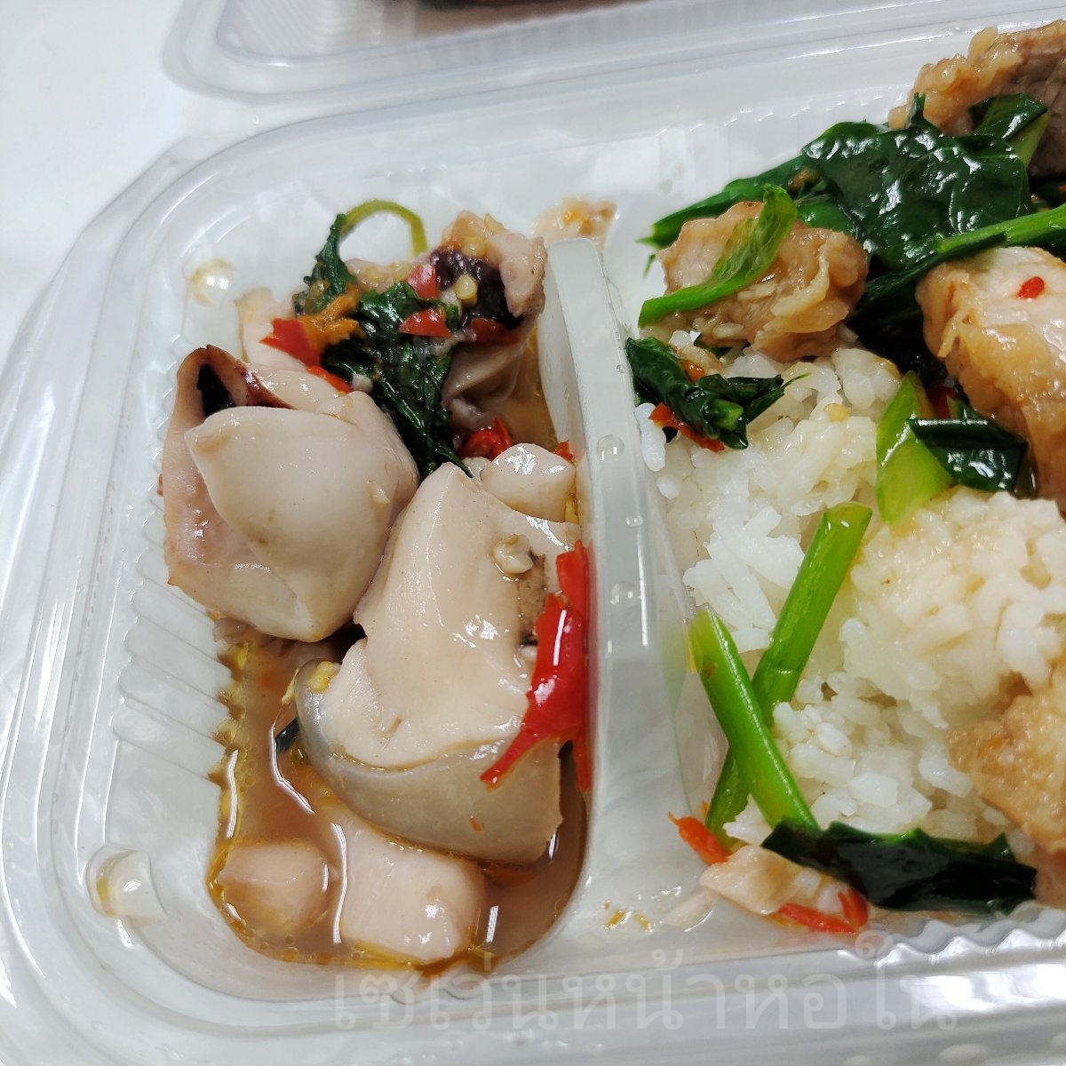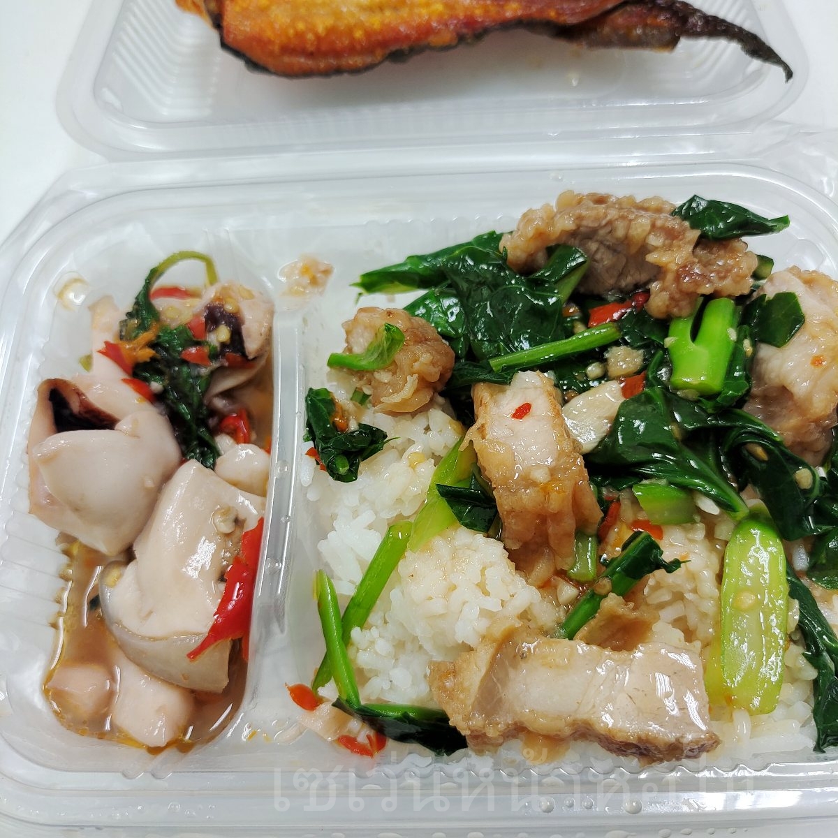 เลือกเป็นคะน้าหมูกรอบ กับ กะเพราปลาหมึก ครับ ราคา 50 บาท