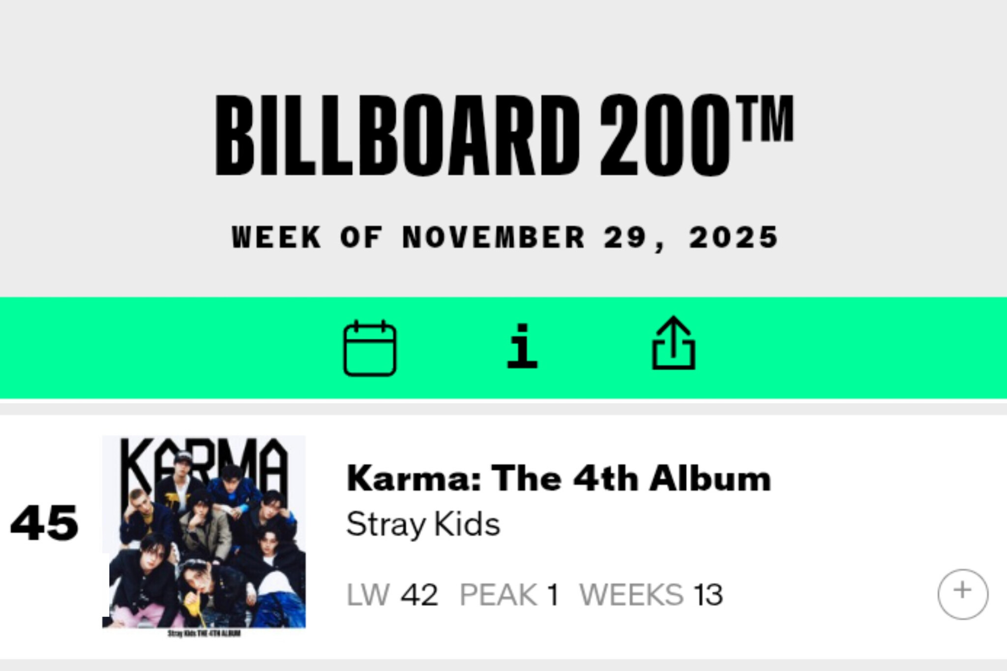 🔥 Stray Kids "KARMA" ได้กลายเป็นอัลบั้มแรกในปี 2025 ของศิลปิน K-Pop ที่สามารถคงอยู่ใน 45 อันดับแรกของ Billboard 200 ได้นานถึง 13 สัปดาห์ติดต่อกัน
