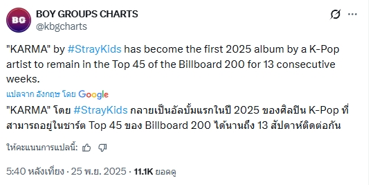 🔥 Stray Kids "KARMA"สถิติยังอยู่ต่อ อัลบั้ม K-Pop ชุดแรกในปี 2025ที่อยู่ในชาร์ต Top 90 ของ Billboard 200 ถึง 11 สัปดาห์