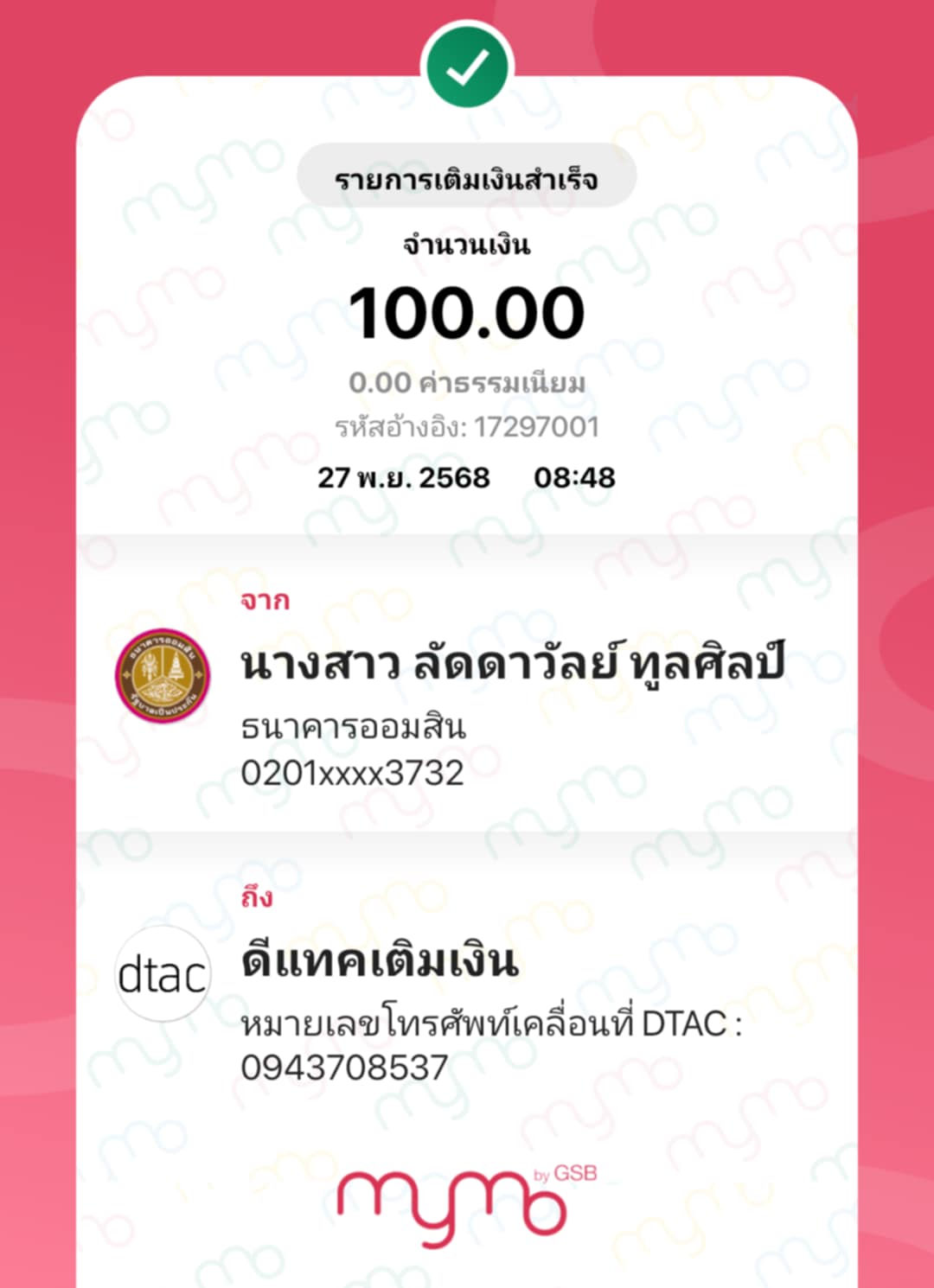 เติมเงิน DtecจากMymo แล้วเงินเข้าไม่ครบ