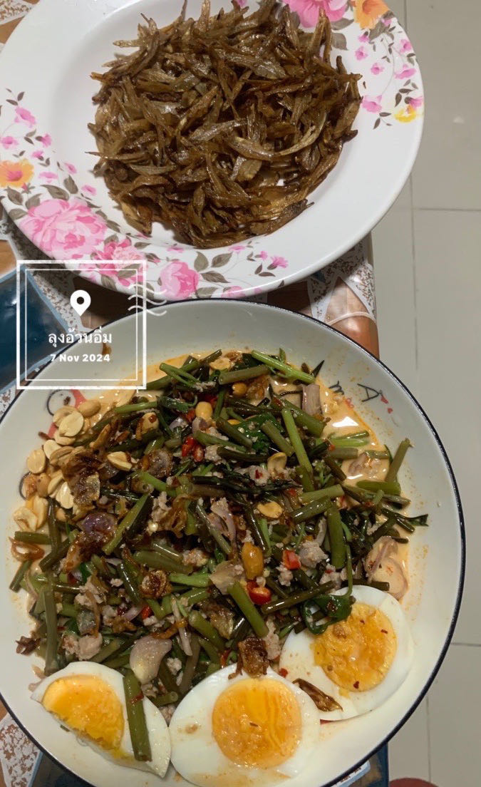 ยำผักบุ้งไทยลวกใส่หมูสับน้ำพริกเผาใส่ไข่ต้ม & ปลาซิวแก้วทอดกรอบ