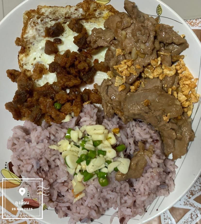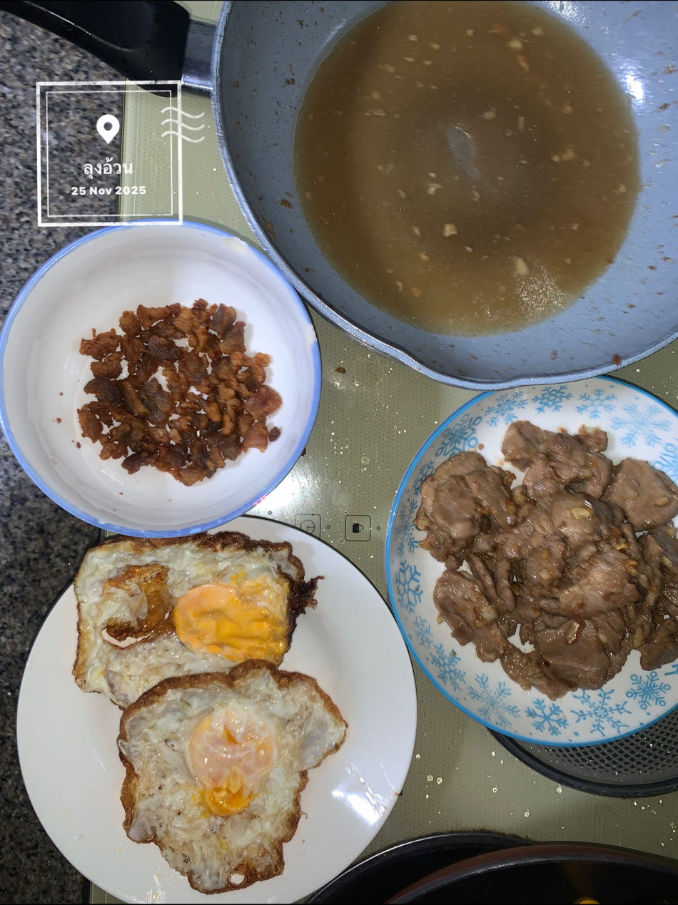 หมูนาบกะทะ & น้ำเกรวี่ & กากหมู & ไข่ดาว & พริกน้ำปลา