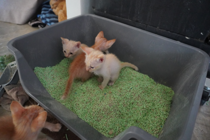 เด็กๆ 4 ตัว อายุประมาณ 1 เดือนครึ่ง ฝึกให้เข้ากระบายทรายได้แล้ว