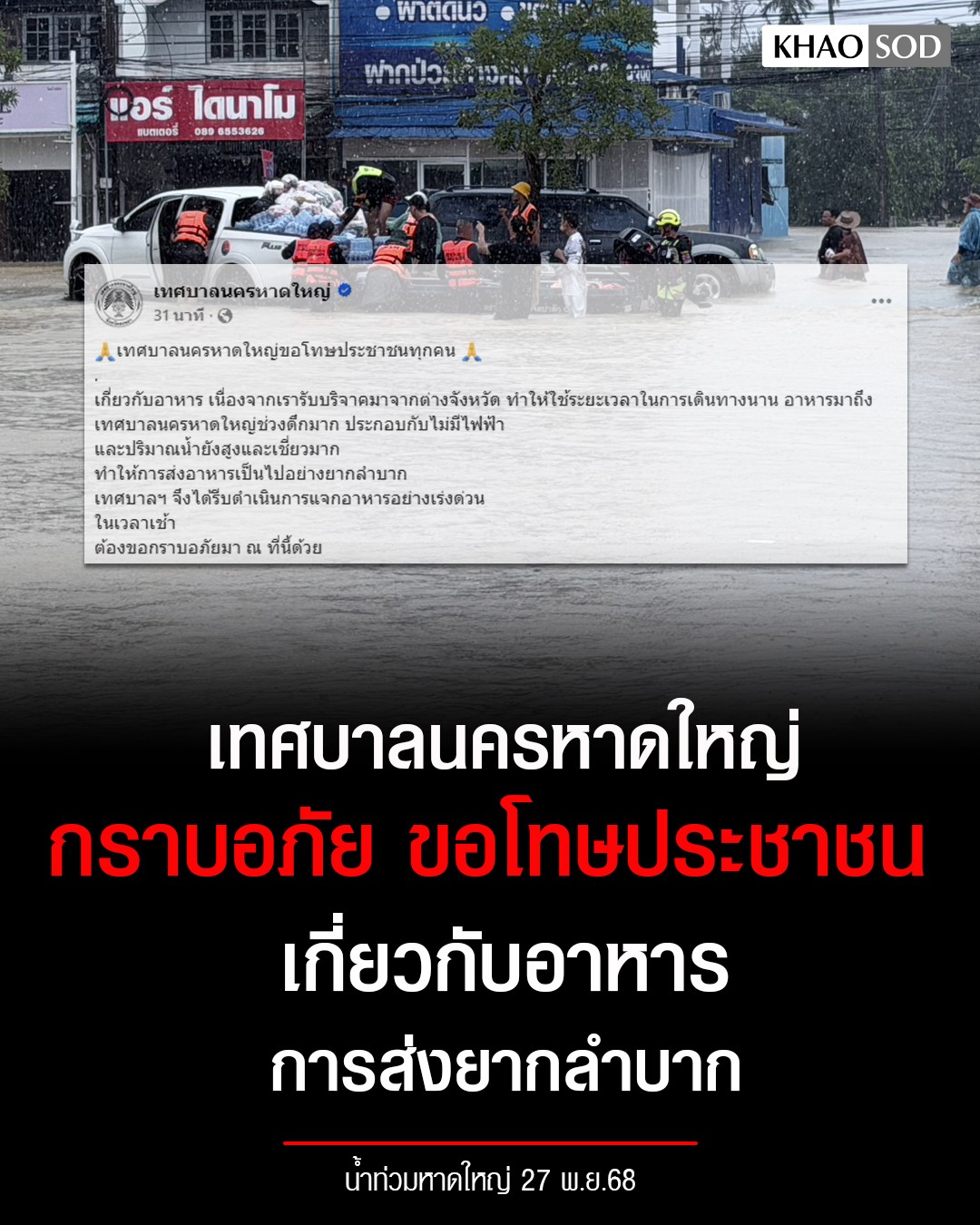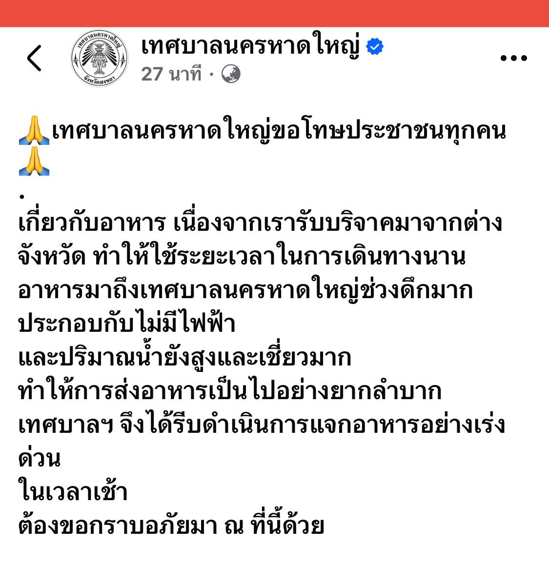 เทศบาลนครหาดใหญ่ขอโทษประชาชนทุกคน เกี่ยวกับอาหาร เนื่องจากเรารับบริจาคมาจากต่างจังหวัด ทำให้ใช้ระยะเวลาในการเดินทางนาน อาหารมาถึงเทศบาลนครหาดใหญ่ช่วงดึกมาก ประกอบกับไม่มีไฟฟ้า และปริมาณน้ำยังสูงและเชี่ยวมาก