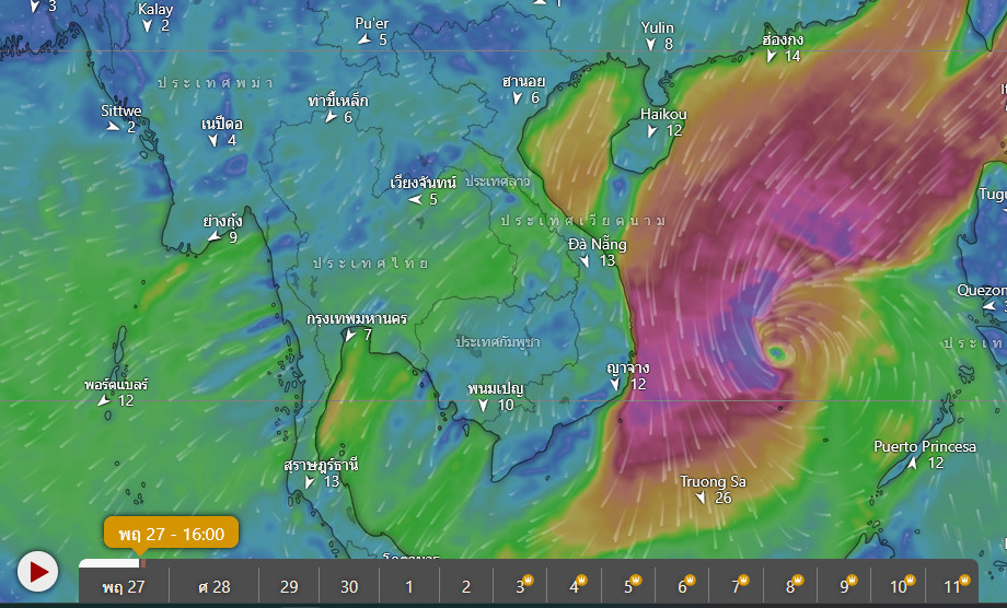 พายุโซนร้อนกำลังแรง “โคโตะ” (KOTO) บริเวณทะเลจีนใต้ตอนกลาง ได้ทวีกำลังขึ้นเป็นพายุไต้ฝุ่นแล้ว โดยเมื่อเวลา 04.00 น. ของวันนี้ (27 พ.ย. 68) มีศูนย์กลางอยู่ที่ละติจูด 13.1 องศาเหนือ ลองจิจูด 114.3 องศาตะวันออก ความเร็วลมสูงสุดใกล้ศูนย์กลางประมาณ 113 กิโลเมตรต่อชั่วโมง กำลังเคลื่อนตัวทางทิศตะวันตกค่อนไปทางเหนือเล็กน้อย ด้วยความเร็วประมาณ 15 กิโลเมตรต่อชั่วโมง ในขณะที่บริเวณความกดอากาศสูงหรือมวลอากาศเย็นปกคลุมบริเวณประเทศเวียดนามและทะเลจีนใต้ คาดว่าพายุนี้จะอ่อนกำลังลงอย่างรวดเร็วบริเวณชายฝั่งประเทศเวียดนามตอนใต้