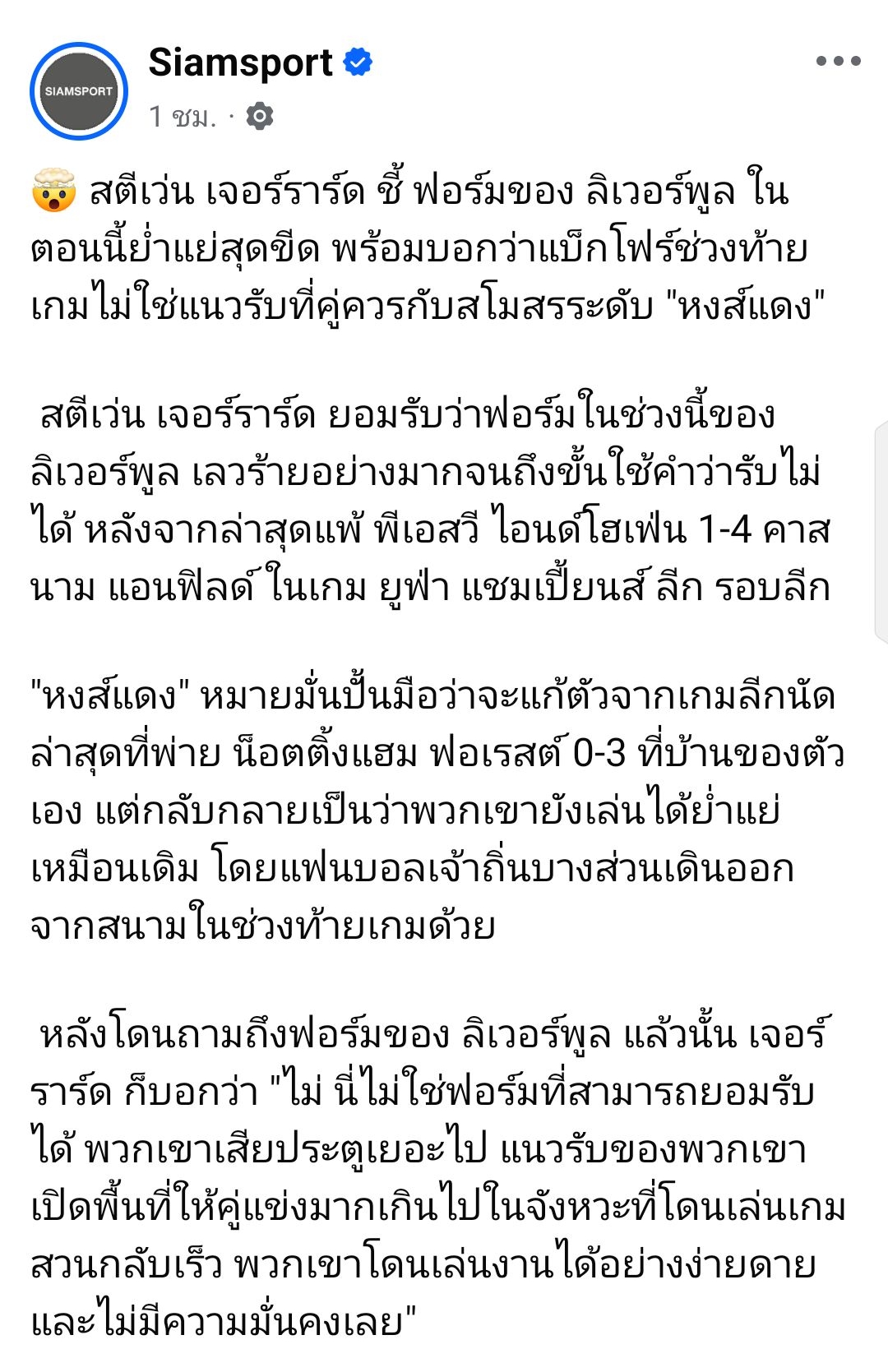 🤯 สตีเว่น เจอร์ราร์ด ชี้ ฟอร์มของ ลิเวอร์พูล ในตอนนี้ย่ำแย่สุดขีด