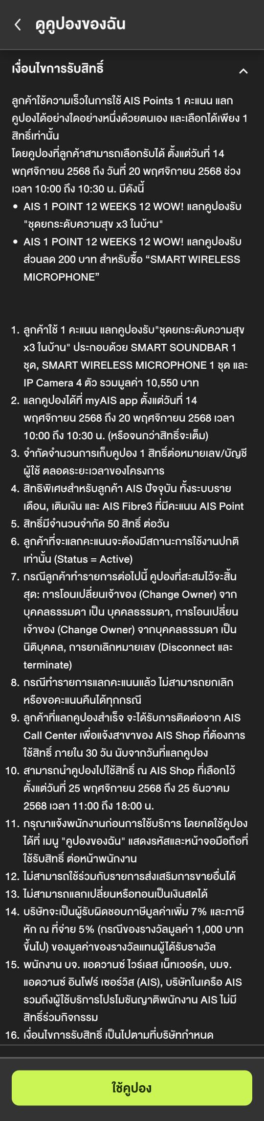 -สามารถนำคูปองไปใช้สิทธิ์ ณ AIS Shop ที่เลือกไว้ ตั้งแต่วันที่ 25 พฤศจิกายน 2568 ถึง 25 ธันวาคม 2568 เวลา 11:00 ถึง 18:00 น.