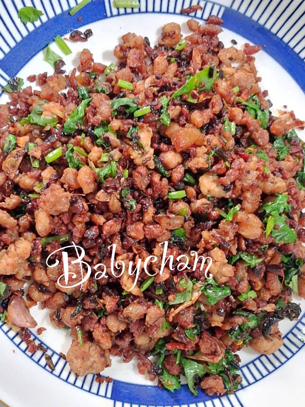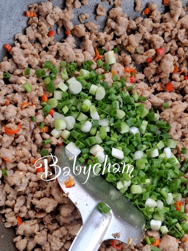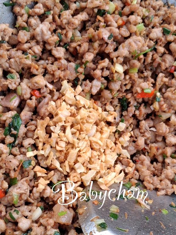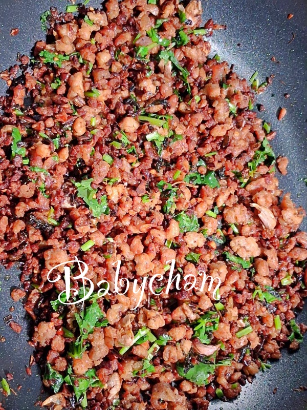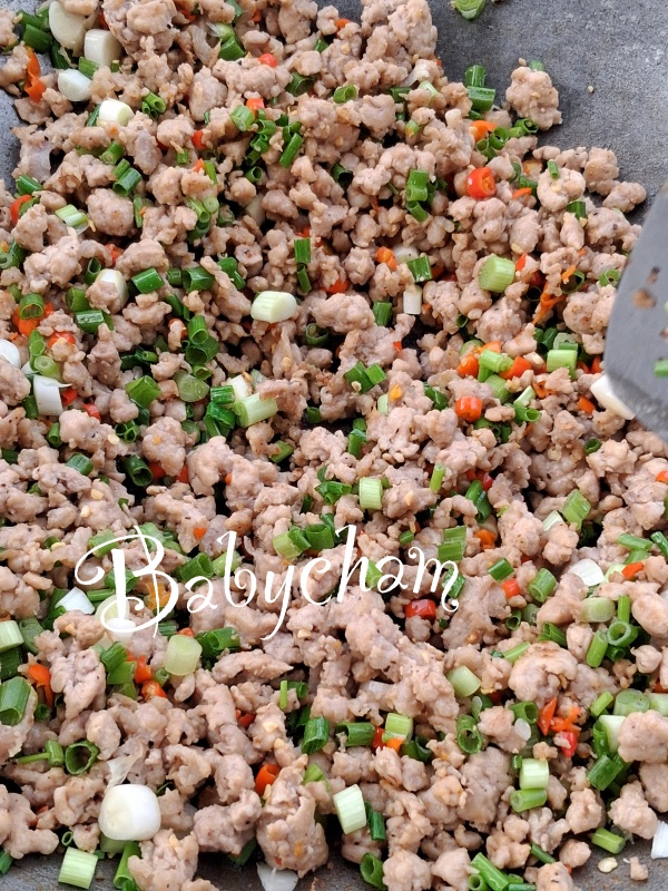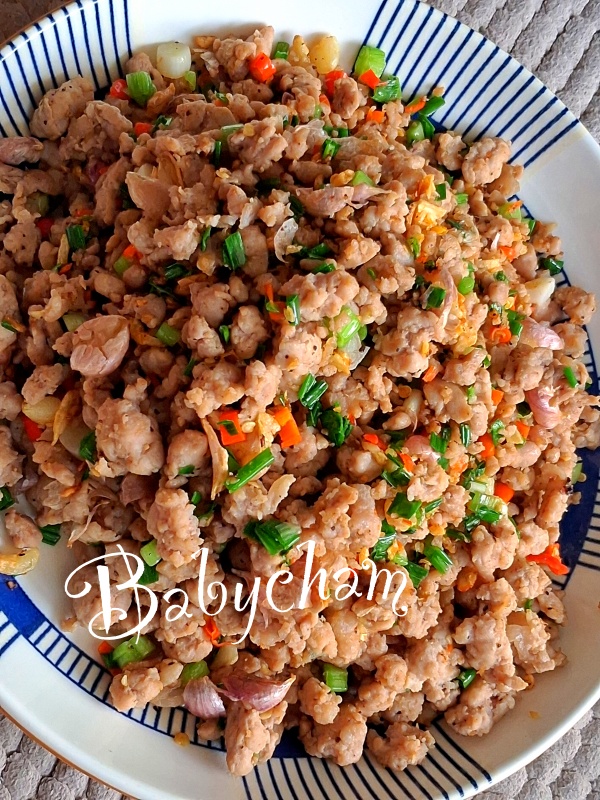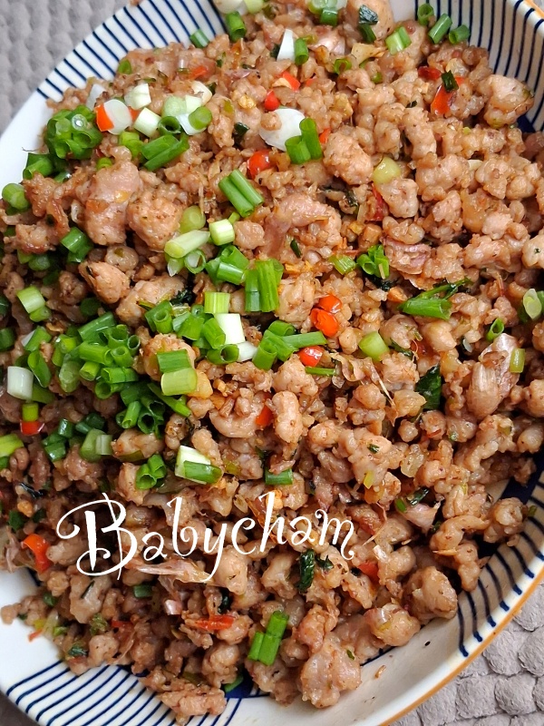 กินที่ร้านอร่อยมากกก ติดใจจนครั้งต่อไป ก็แอบดูเวลาเขาทำ 55 แล้วก็อาศัยชิมในจานที่เขามาเสริฟ เอามาลองทำกินเอง หมูสับจะกรอบๆแห้งๆค่ะ แต่ไม่แห้งฝืดคอนะคะ แห้งแบบใส่ปากต่อเนื่องได้สบายๆ
