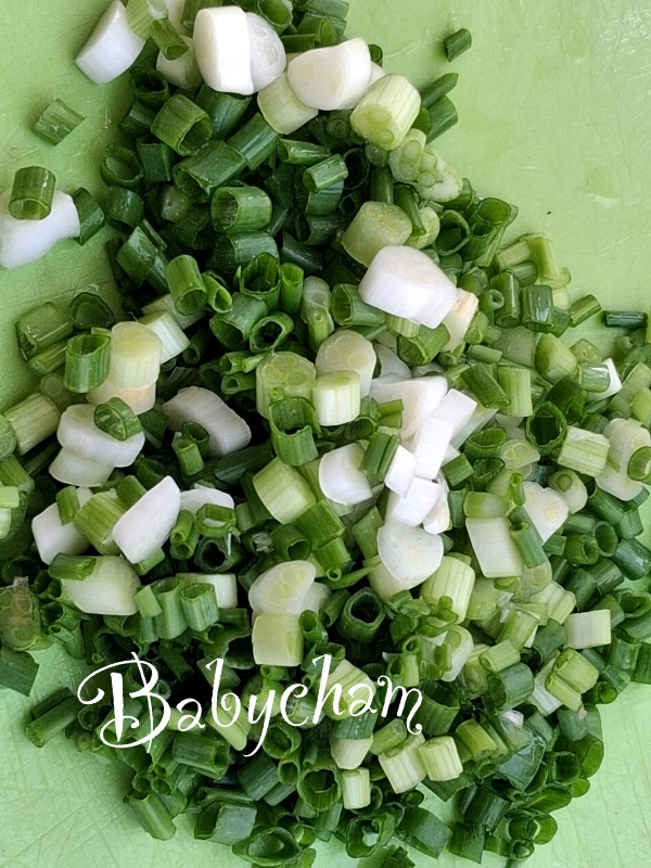 เรามาเตรียมของกันก่อน ต้นหอมค่ะ ล้างแล้วซอยท่อนสั้นๆ เตรียมไว้เลย