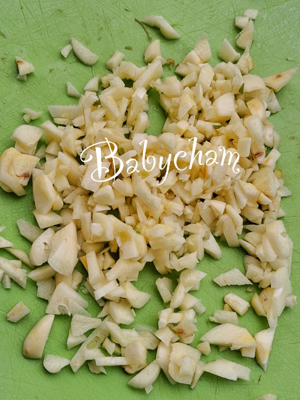 กระเทียมจีนปอกเปลือกเอาแต่เนื้อมาสับหยาบๆค่ะ ครั้งแรกลองใช้กระเทียมไทยสับทั้งเปลือกเพราะกระเทียมไทยจะหอมดี แต่กินแล้วเปลือกทำให้เสียรสชาติ แกะเปลือกออกก็เหลือเนื้อน้อยเพราะกระเทียมไทยเขาจะกลีบเล็ก