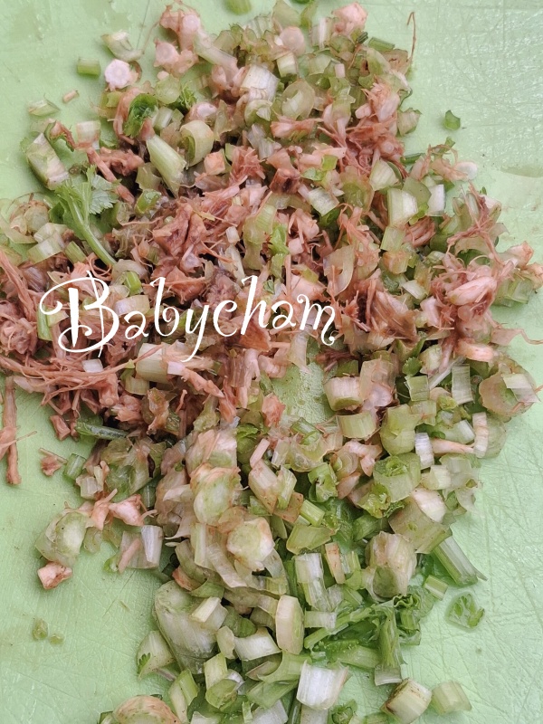 นำมาล้าง หั่น และสับให้เล็กลงสักเล็กน้อย แต่ไม่เอาไปบดหรือตำ ใช้หี่นสับเอา รากผักชีที่ซื้อมาล้างหลายน้ำ แต่รากไม่ค่อยขาว