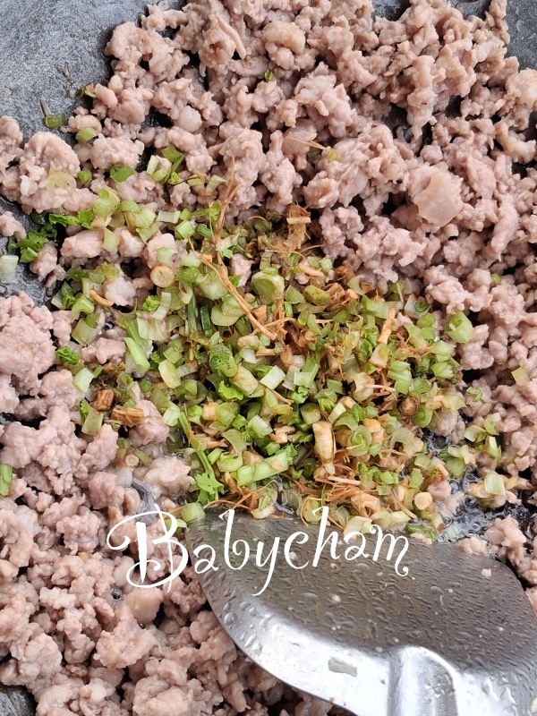 ก็ใส่รากผักชีลงไปค่ะ ผัดๆให้โดนความร้อนจากกะทะผสมเคล้ากับหมูสับนั่นละ ผัดให้เขาสุก ได้กลิ่นหอมเลยค่ะ