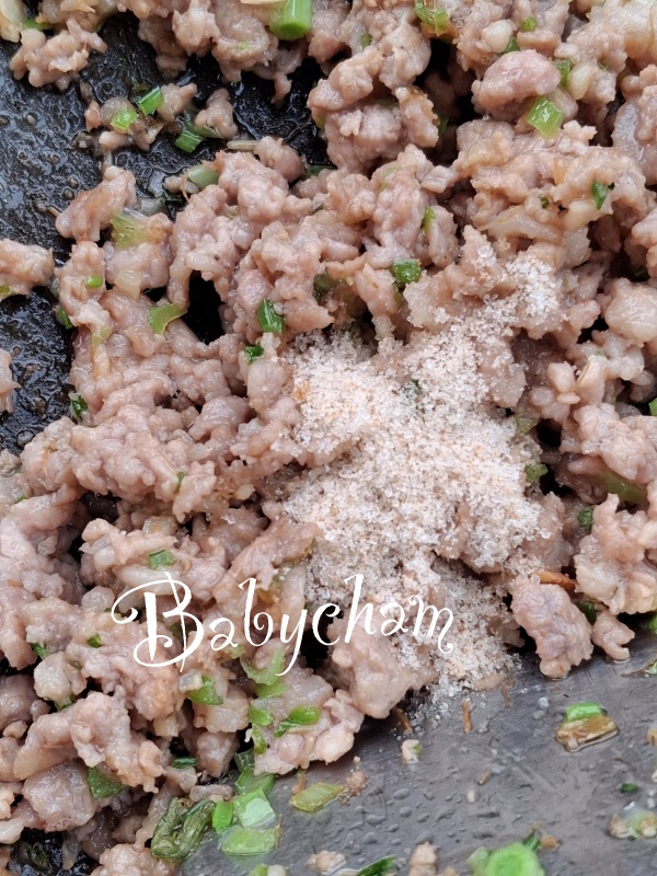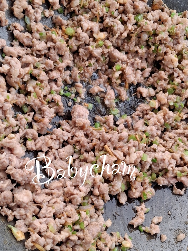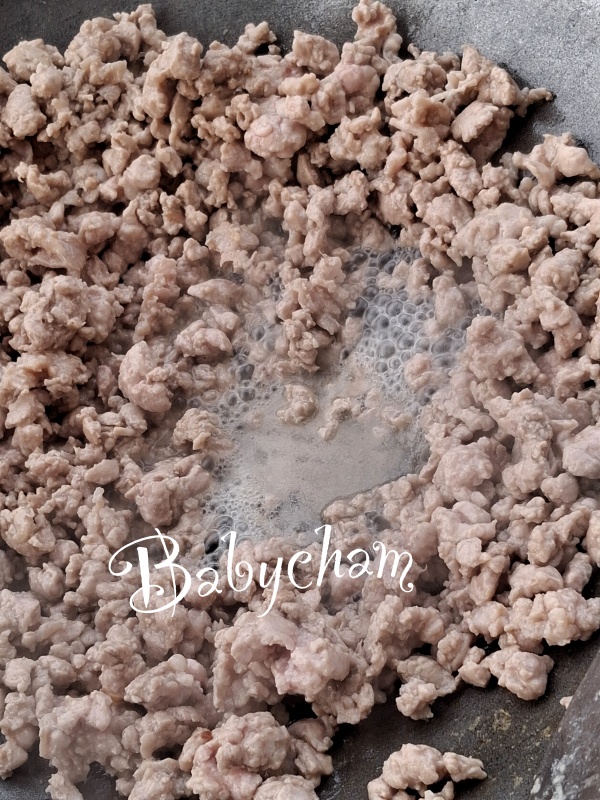ผัดๆ รวนๆ ในกะทะให้เขาไม่จับเป็นก้อนใหญ่นะคะ สักครู่ก็จะมีน้ำหมูออกมา ก็ผัดต่อไปจนหมูสุก น้ำเกือบแห้ง