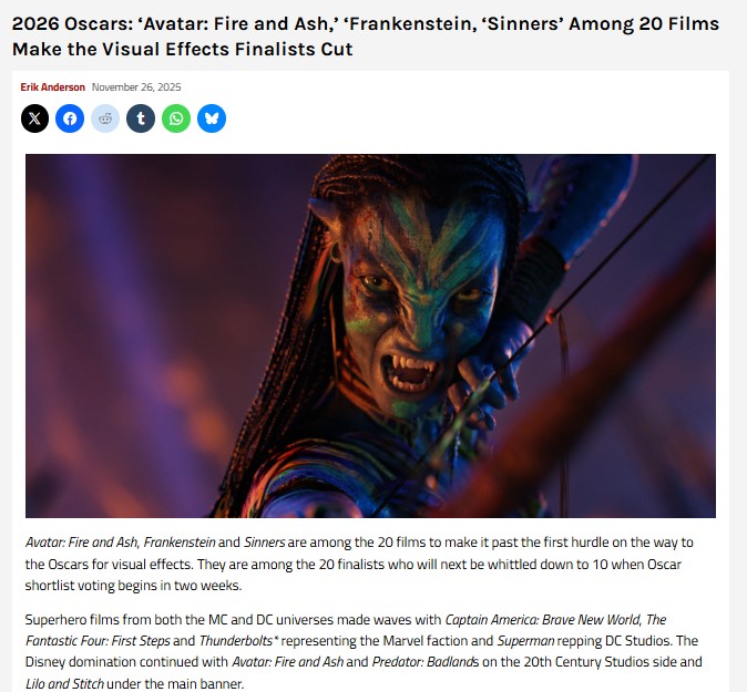 'Avatar: Fire and Ash,' 'Frankenstein และ 'Sinners' ติด 20 อันดับภาพยนตร์ที่เข้ารอบในสาขา VFX ในเวที Oscar ครั้งที่ 98