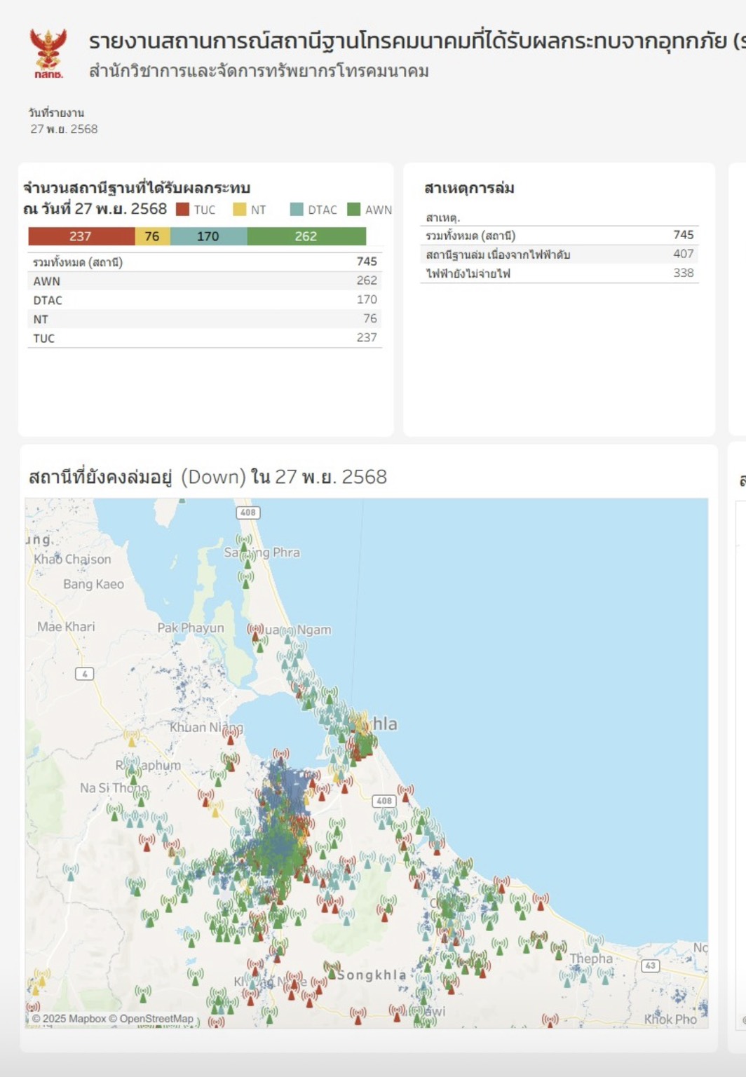 ไปเจอในรายงานสถานการณ์สถานีฐานที่ได้รับผลกระทบจากอุทกภัยของกสทช. 27 พ.ย. 2568 เมื่อตอน 15.30 น. ก็ดูมีความหวังขึ้นเยอะ เค้ารายงานเป็น 2 เรื่อง